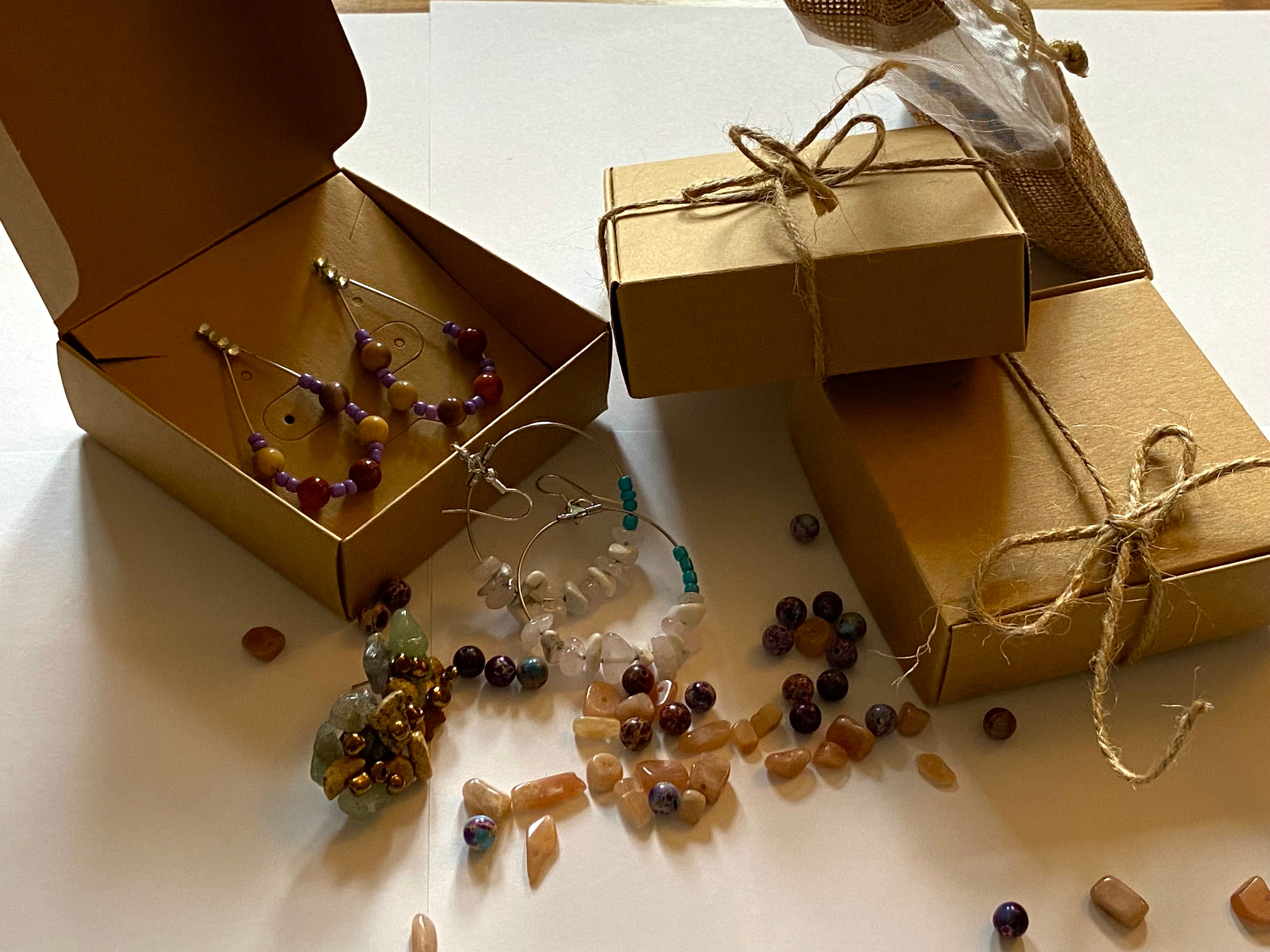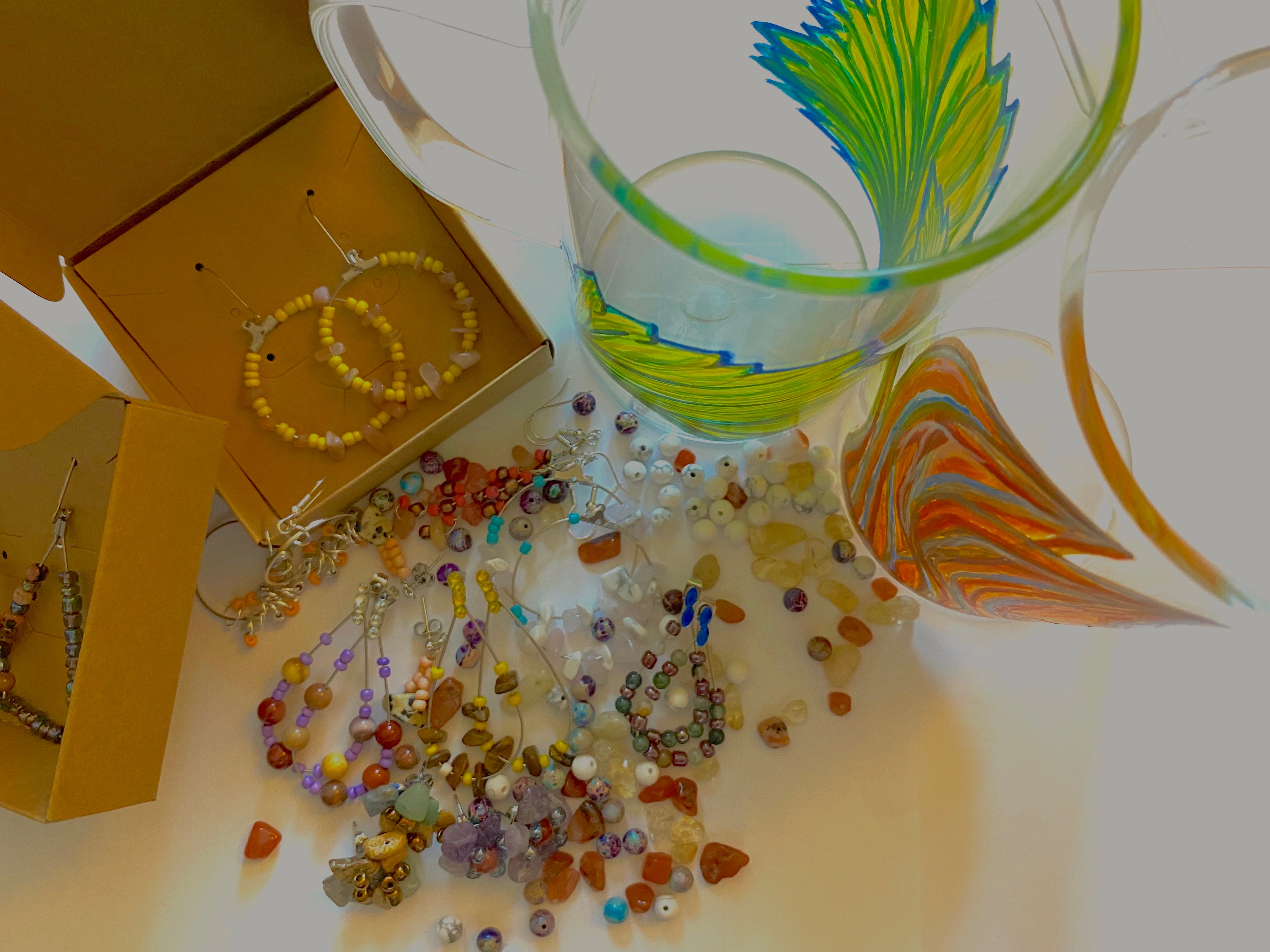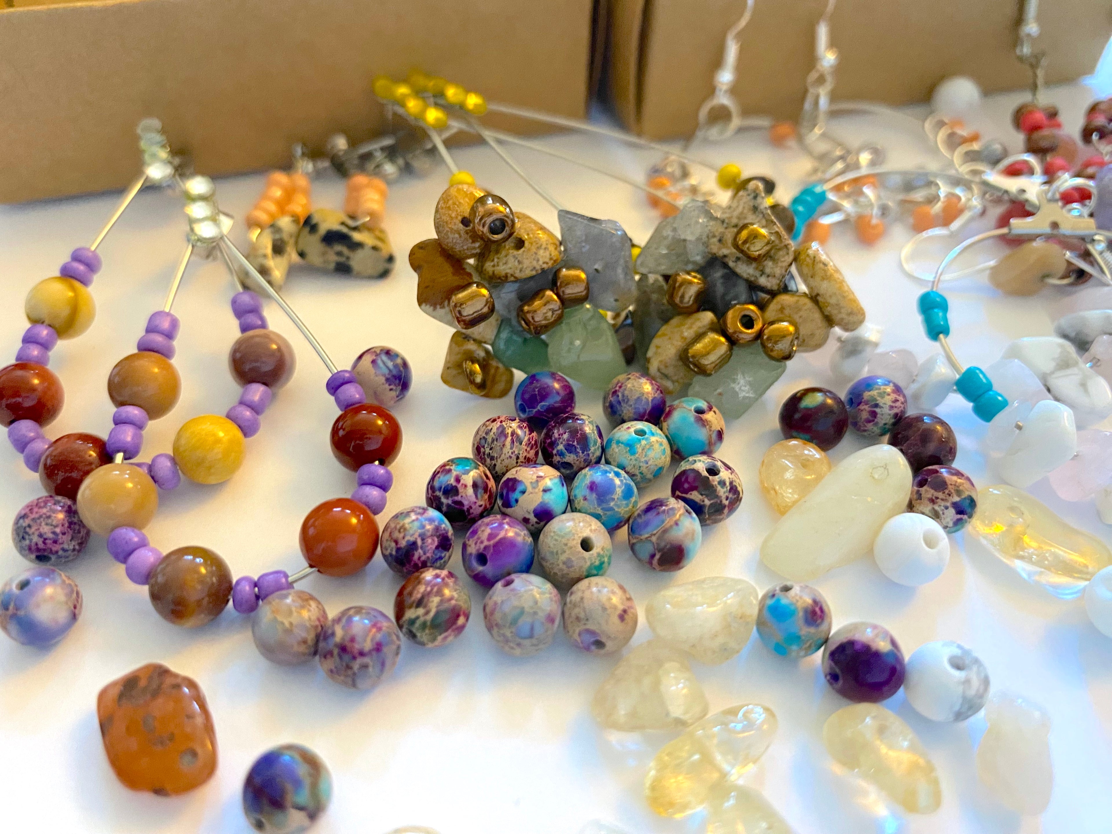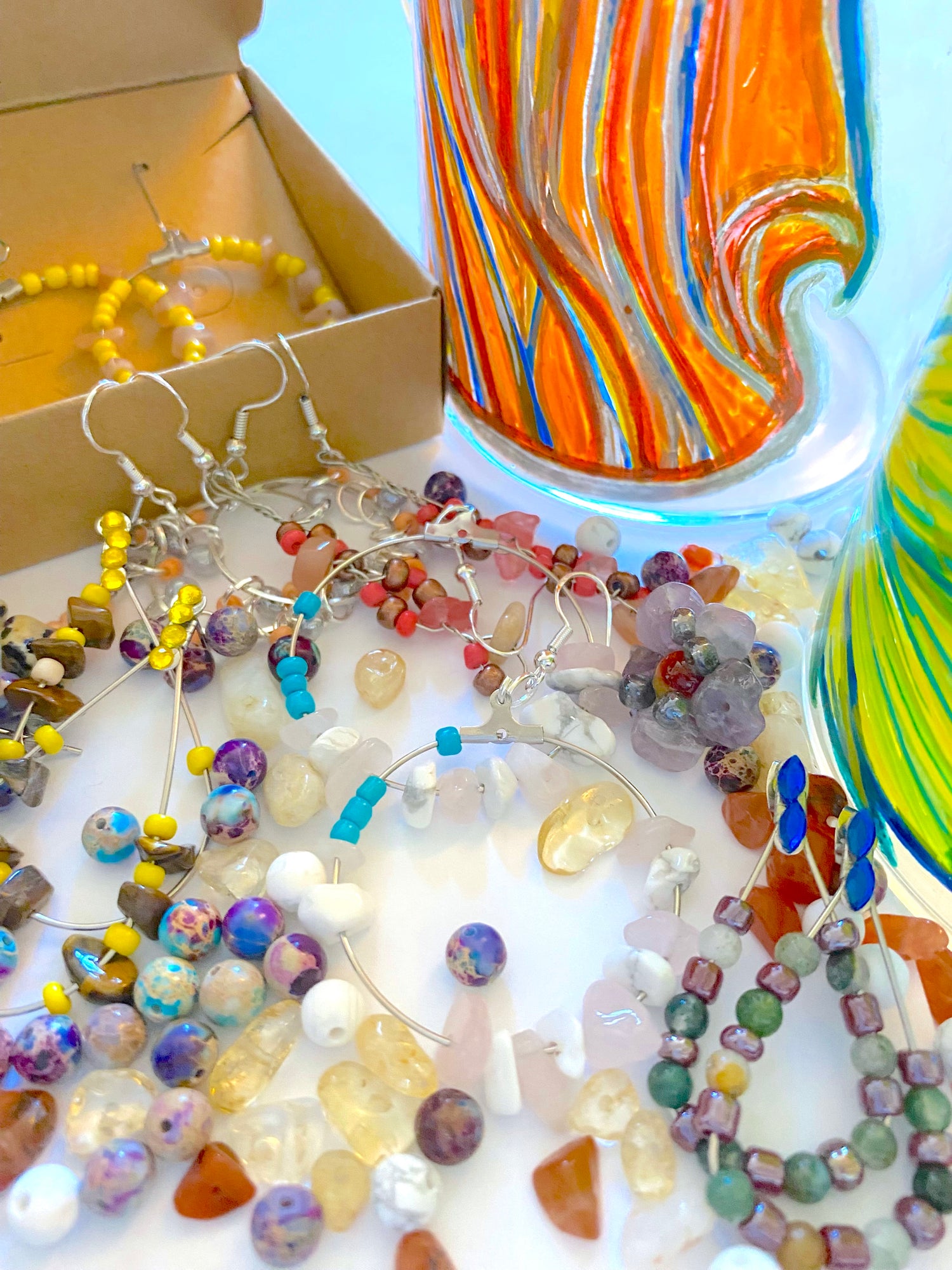 This collection of earrings include studs, dangling teardrops and hoops, and other dangling earrings. Earrings are made by hand using gemstones such as green aventurine, amazonite, blue sodalite, tiger eye, amethyst, and garnet. Glass beads in a variety of colors add detail to each design.
