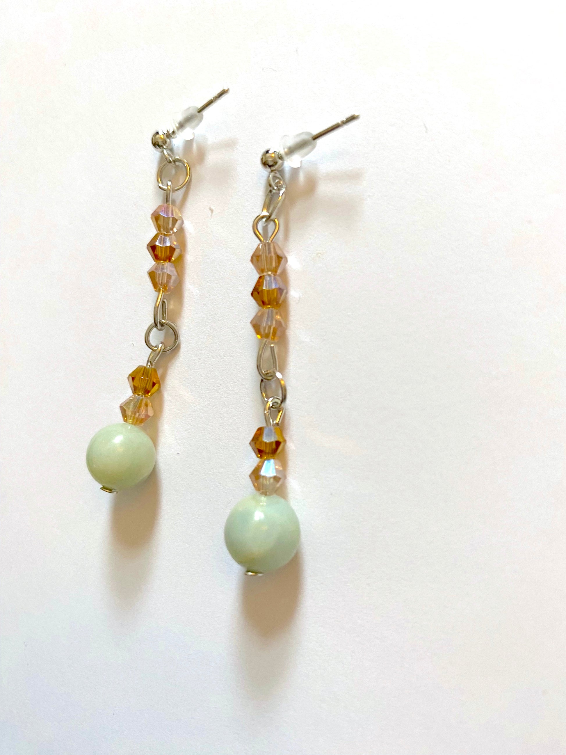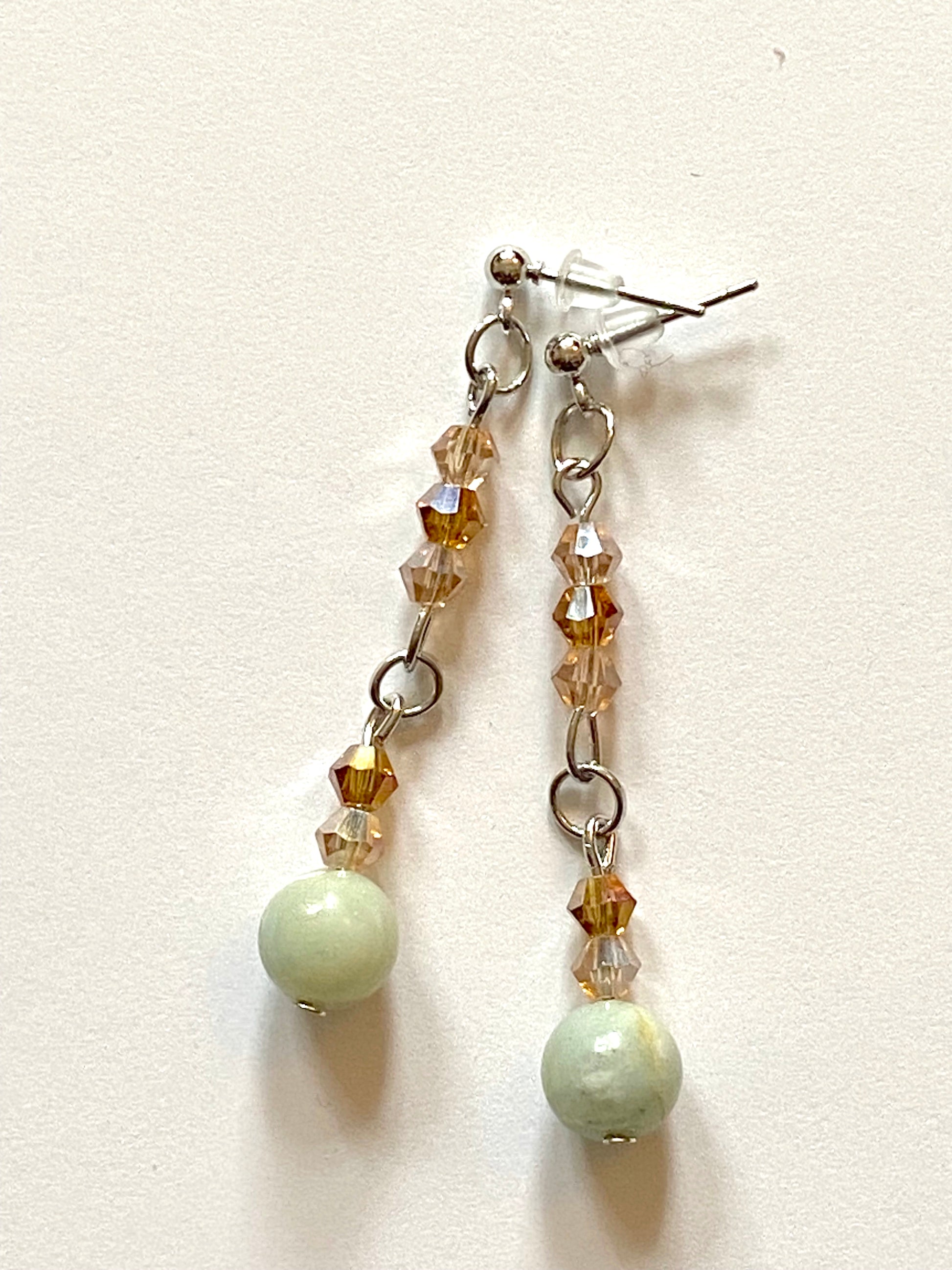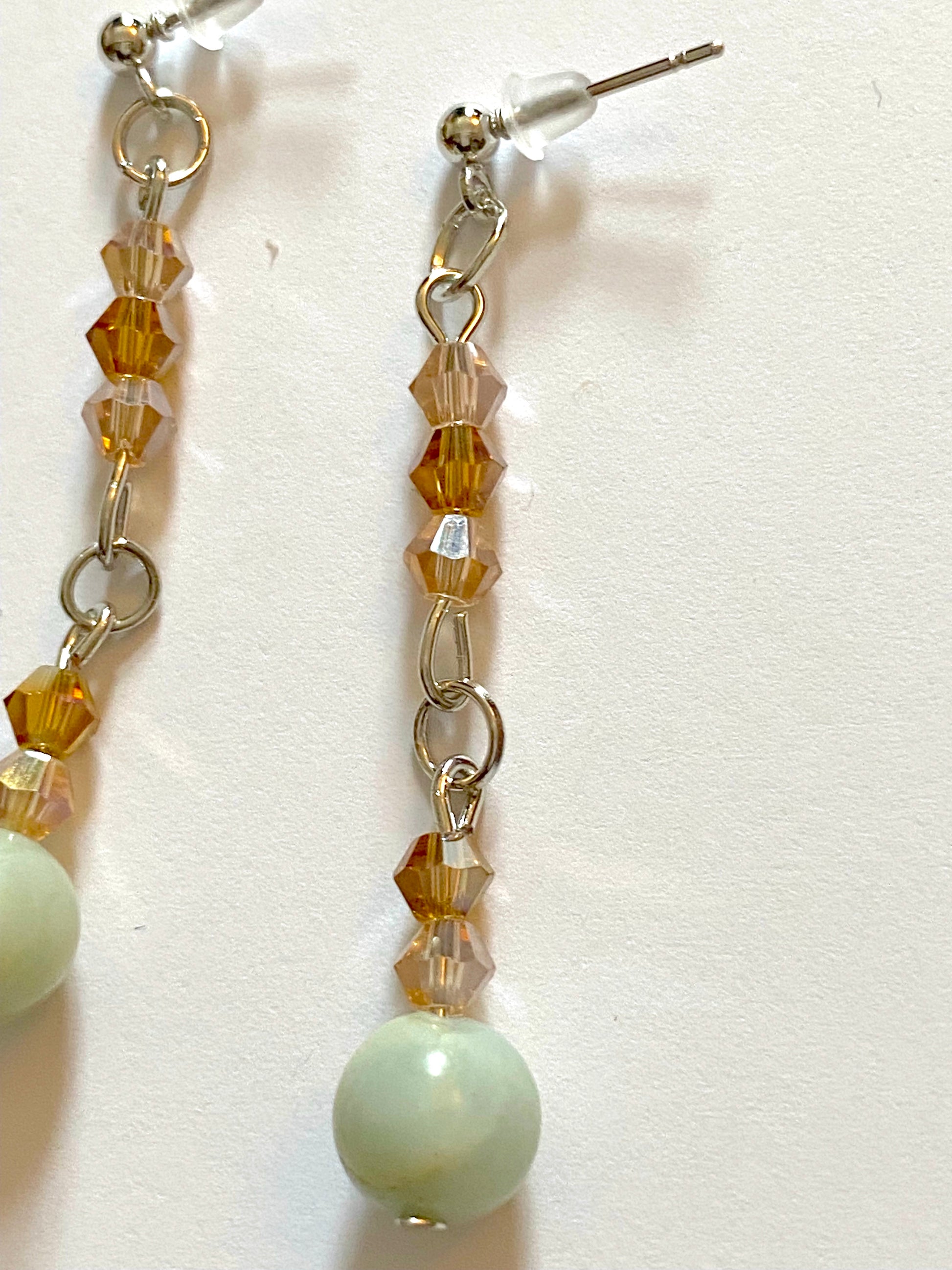 A dash of pale green in natural amazonite gemstones and the shimmering brightness of bicone faceted crystal glass beads are mixed in these elegant dangling earrings. Spruce your dressy outfits with a sparkle. Or brighten your day wear with subtle glitter.