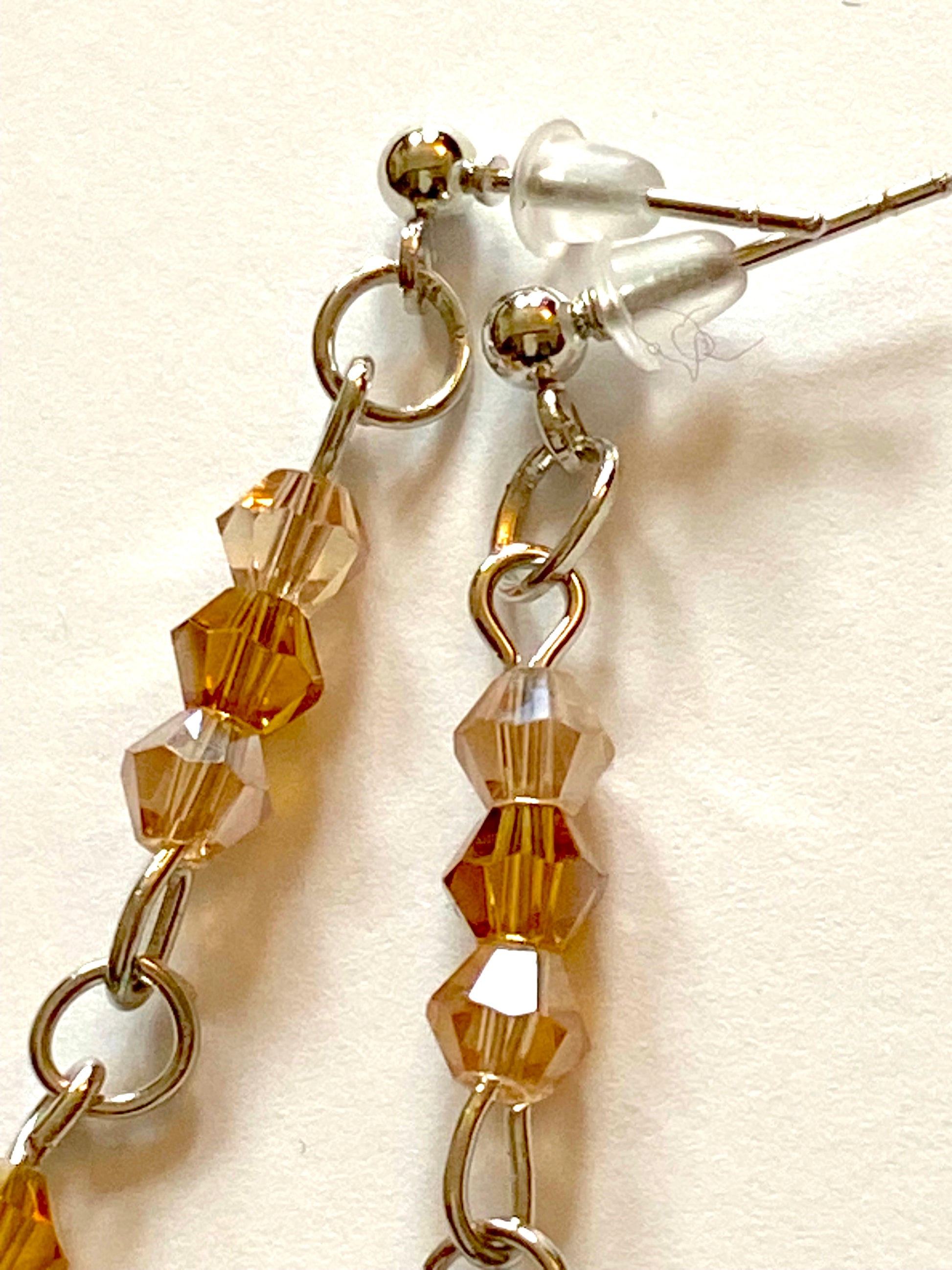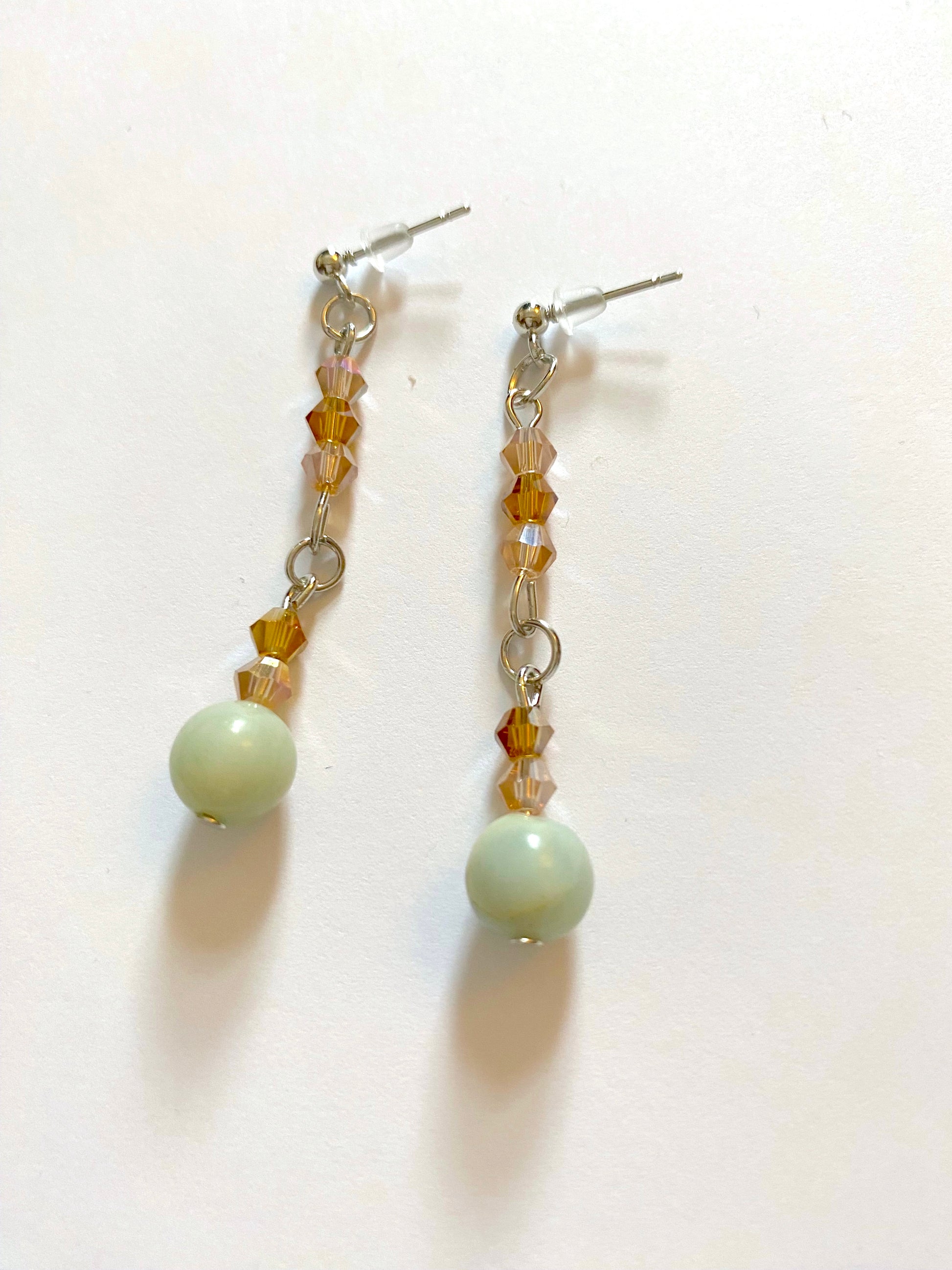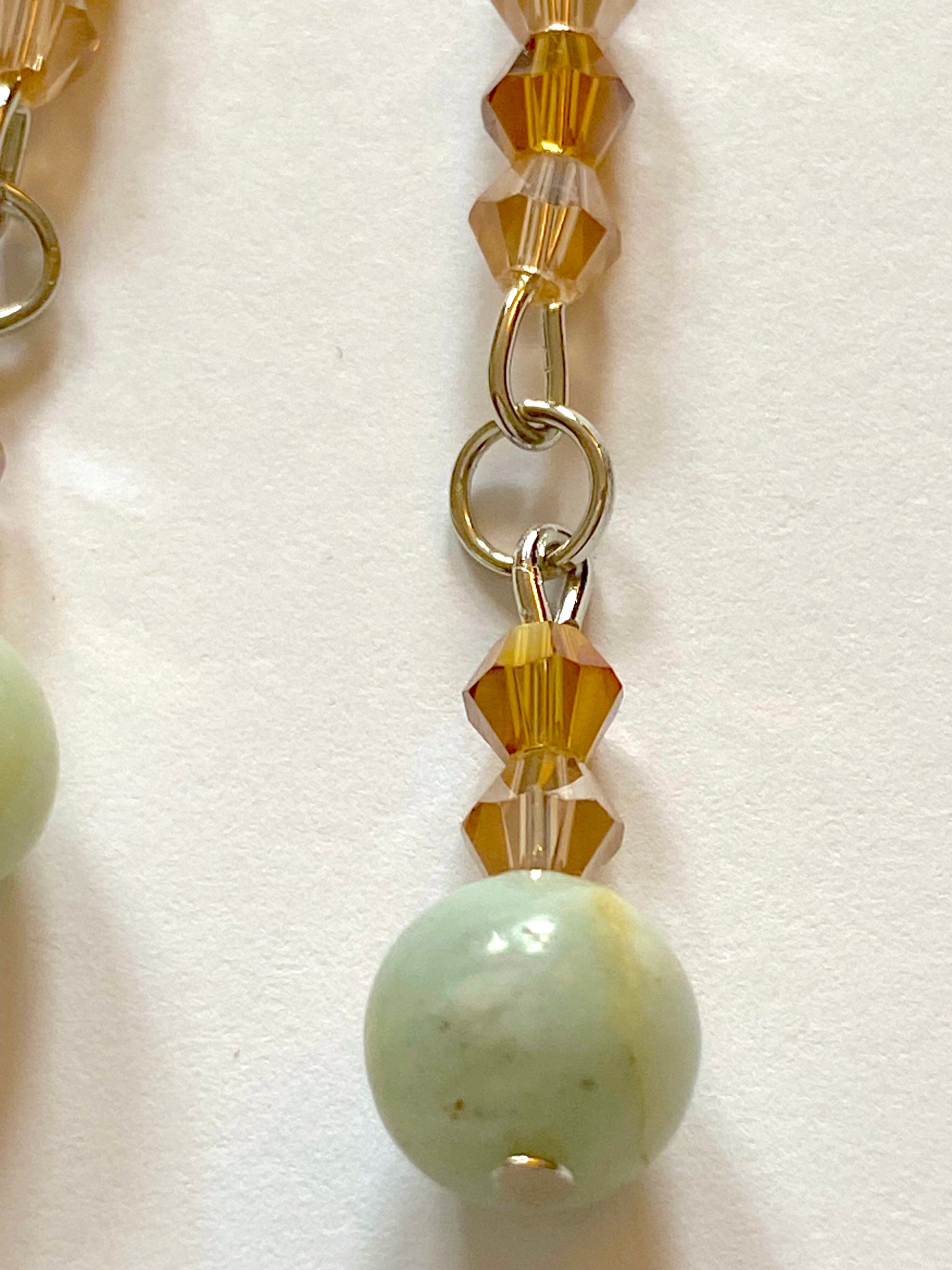 A dash of pale green in natural amazonite gemstones and the shimmering brightness of bicone faceted crystal glass beads are mixed in these elegant dangling earrings. Spruce your dressy outfits with a sparkle. Or brighten your day wear with subtle glitter.