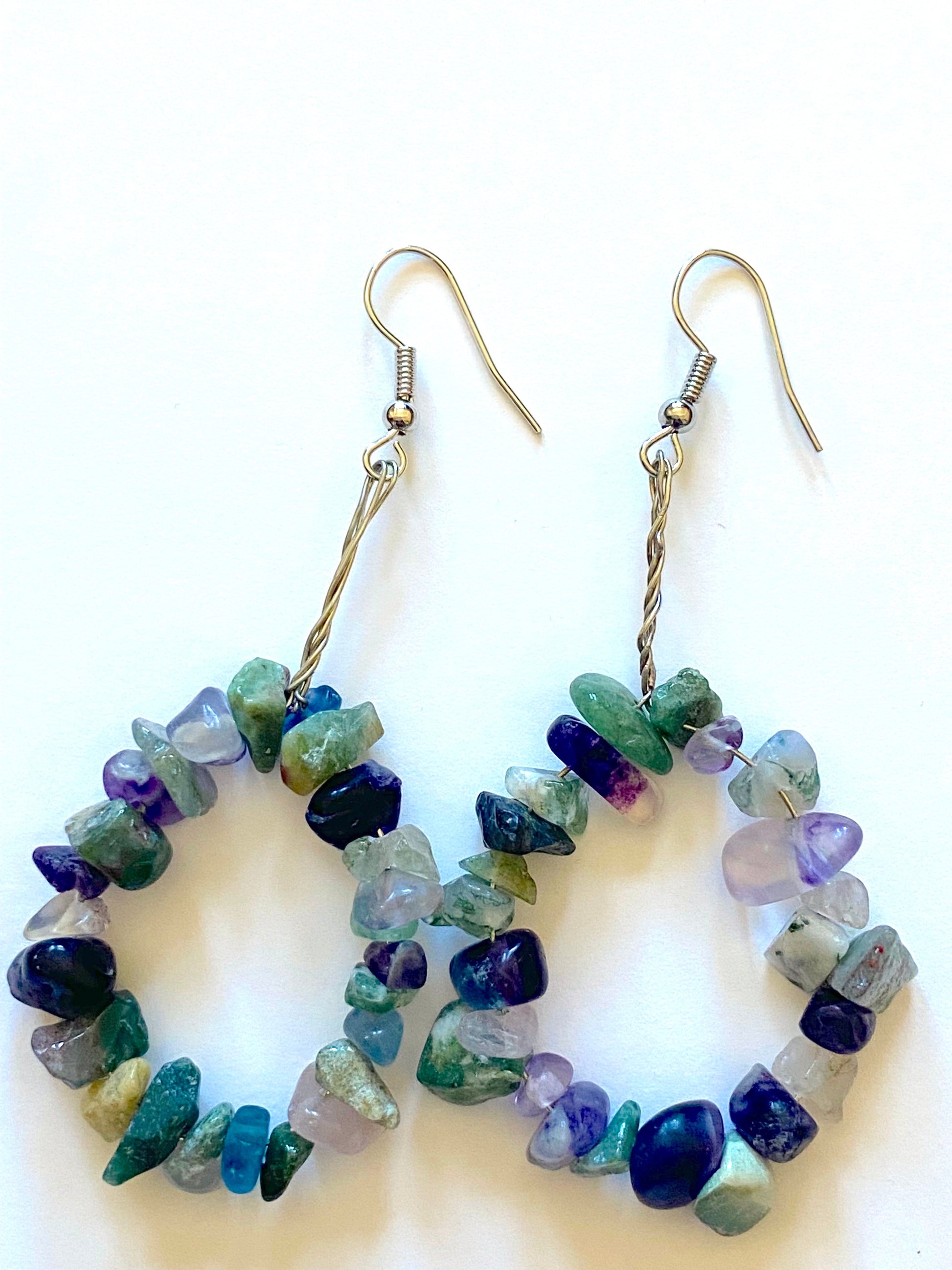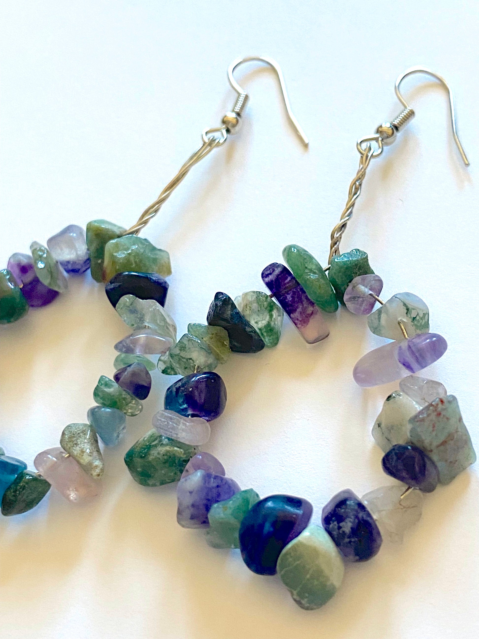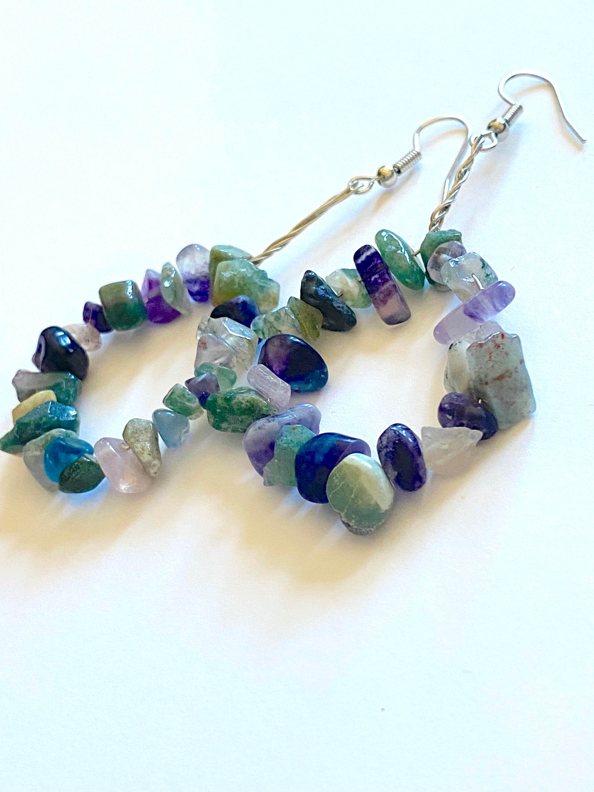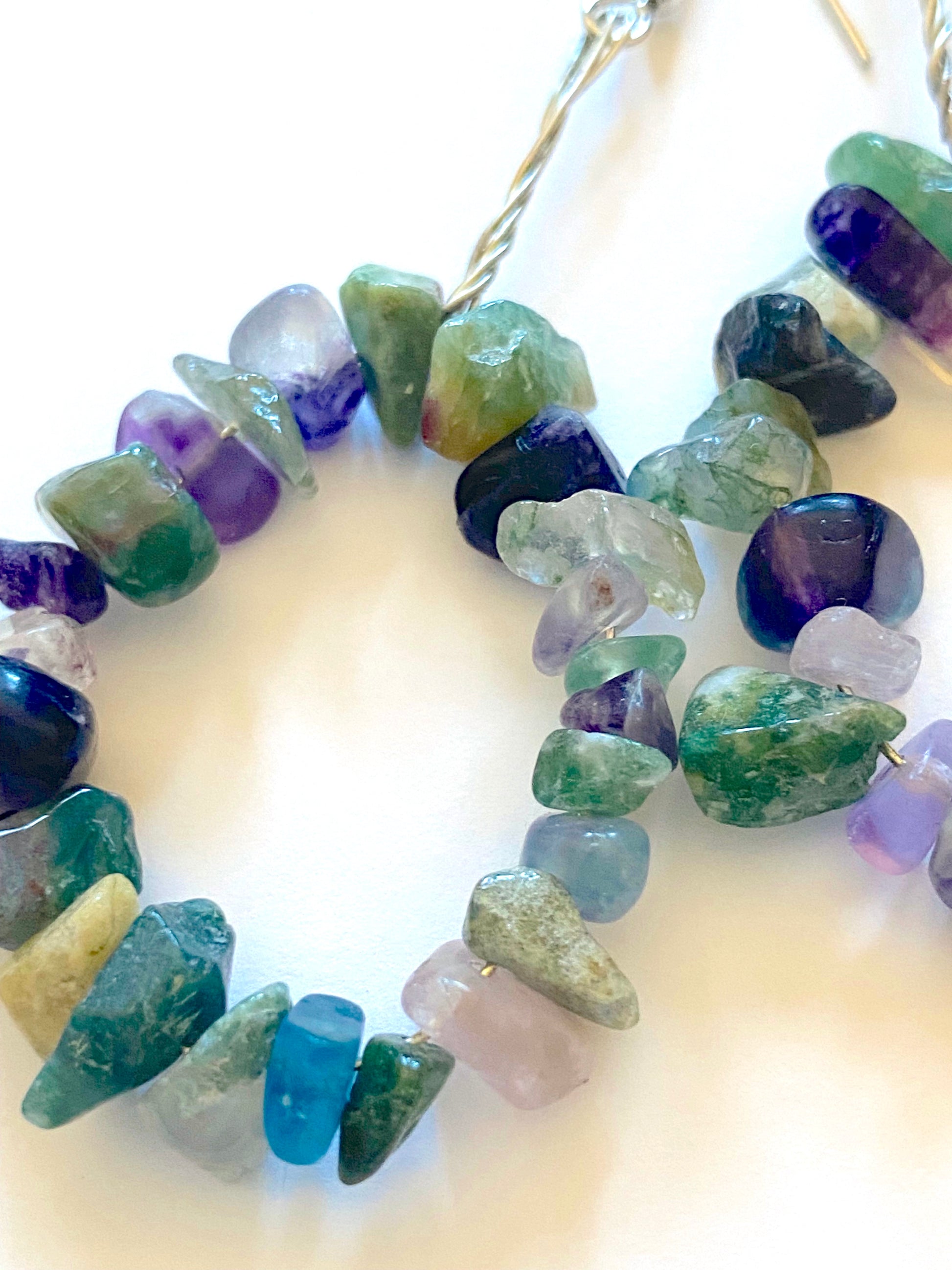 Dress up your look with a pair of handmade dangling earrings crowded with green, and light and dark purple fluorite gemstones. Shades of purple dance with the light to add zest to the pale sea-green fluorite gemstones in these flamboyant large hoops. Party in style or add panache to your daily routine.