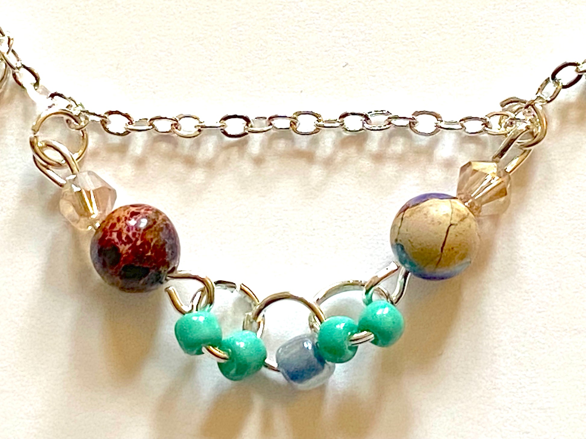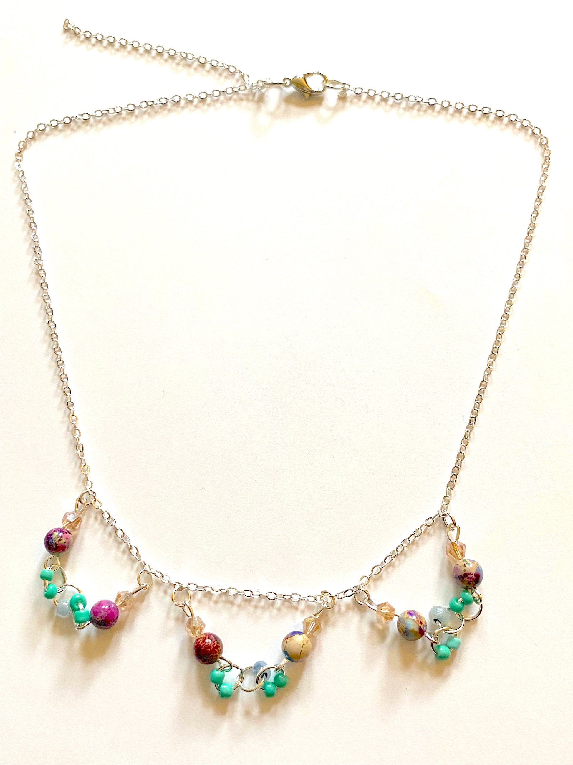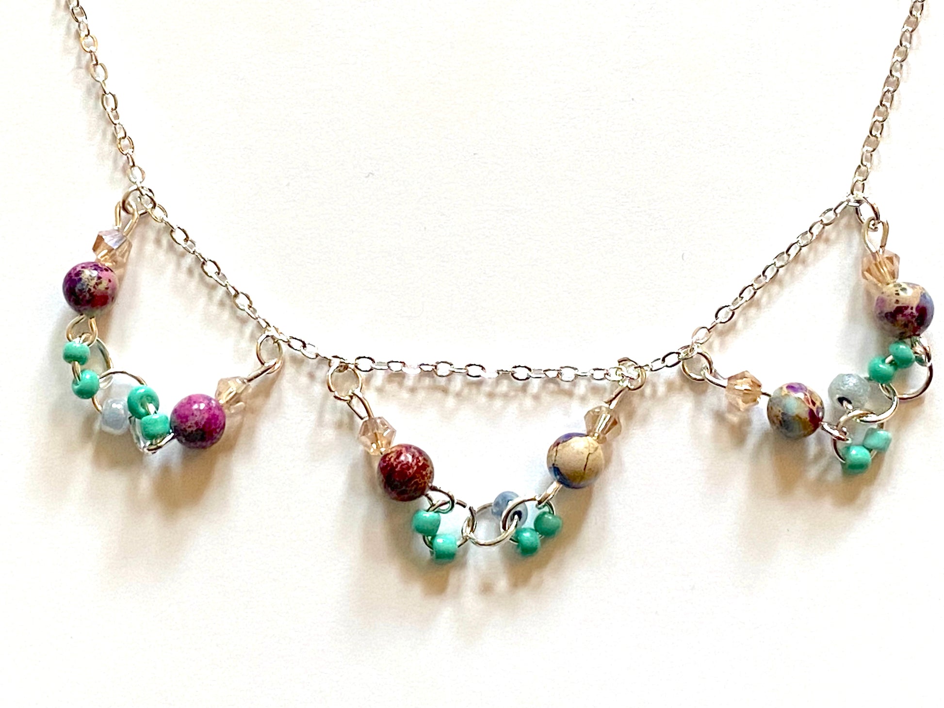 Colorful purple shades in imperial jasper gemstones are subdued by turquoise and gray glass beads in loops or strings in this elegant silver metal chain necklace. Wear it as your main jewel with subtle accessories or with similar accessories to match your fashion style.