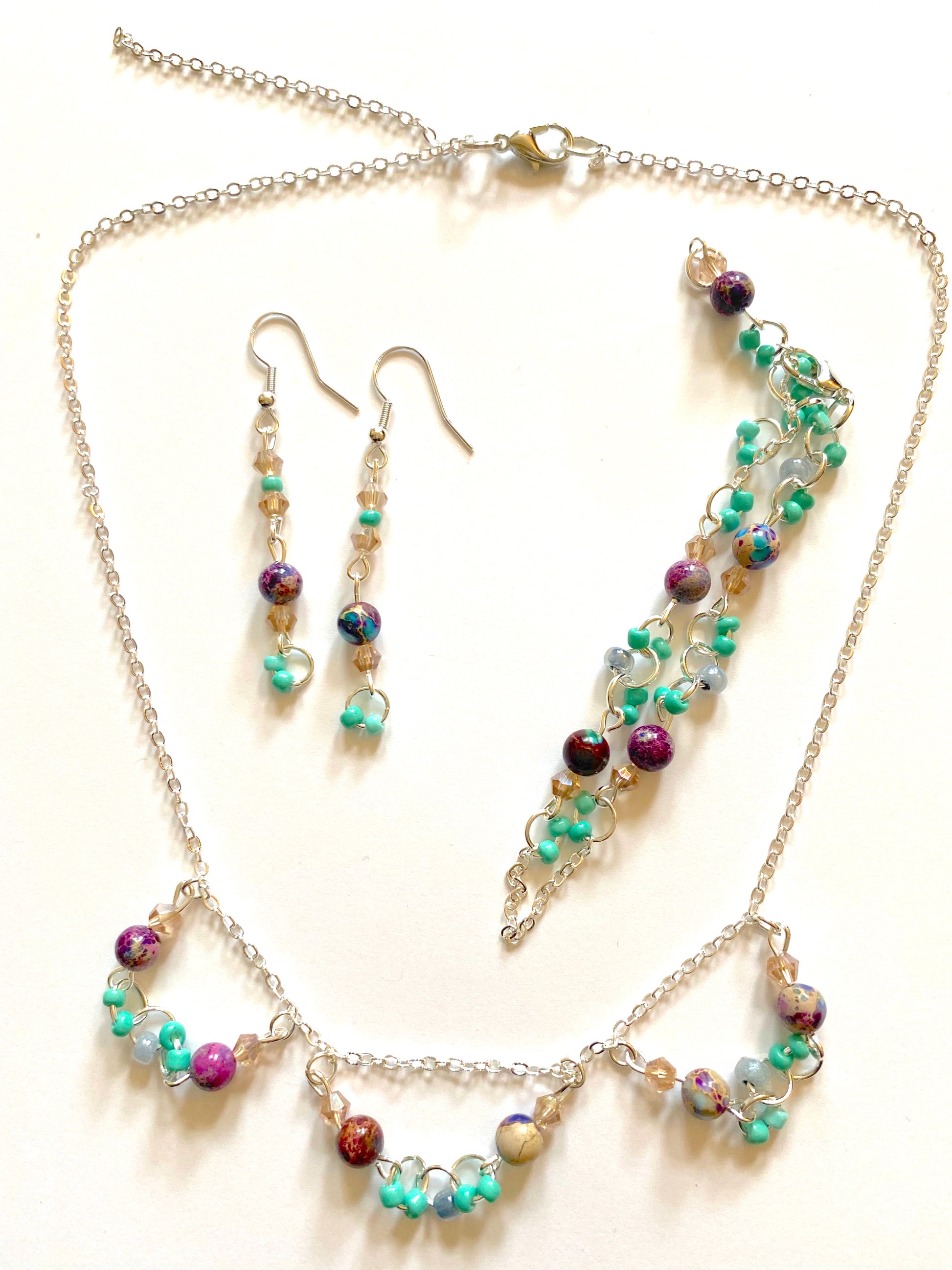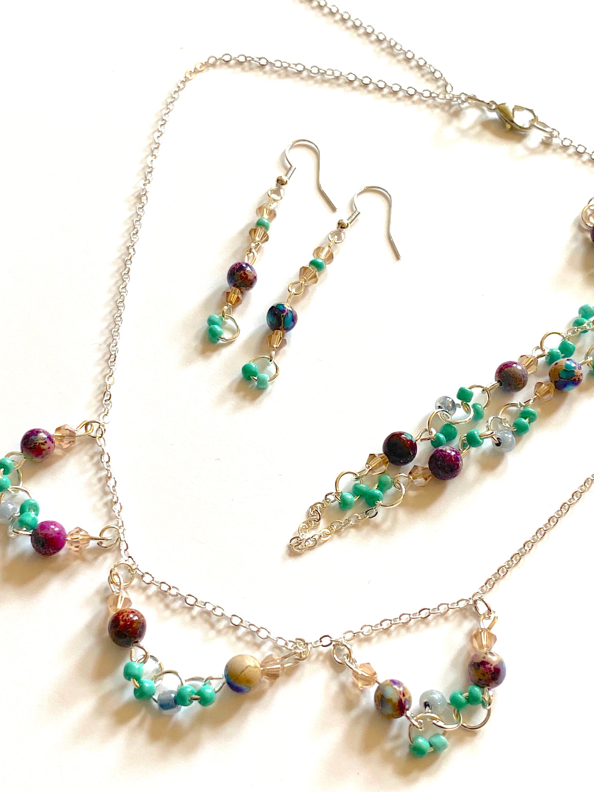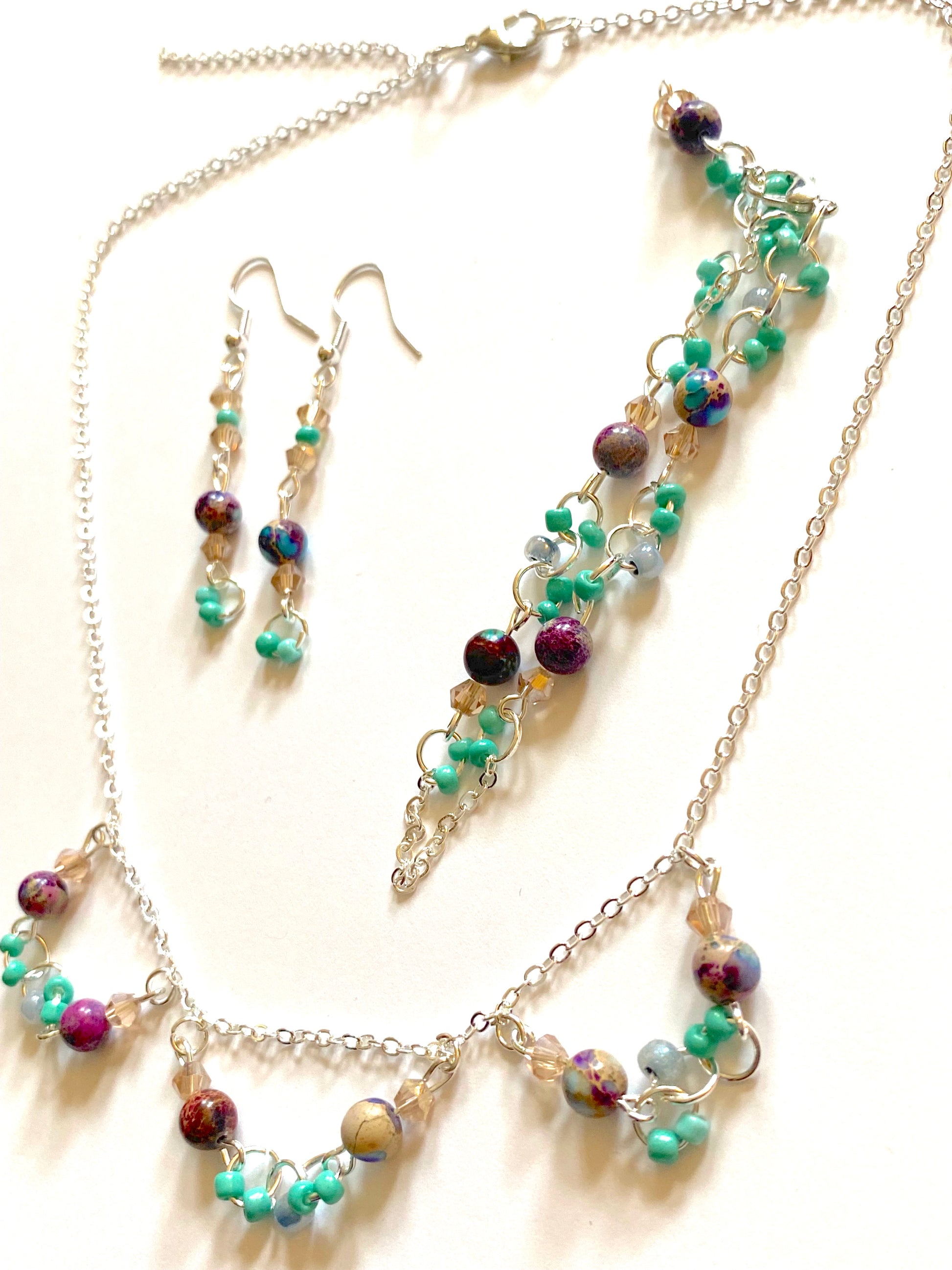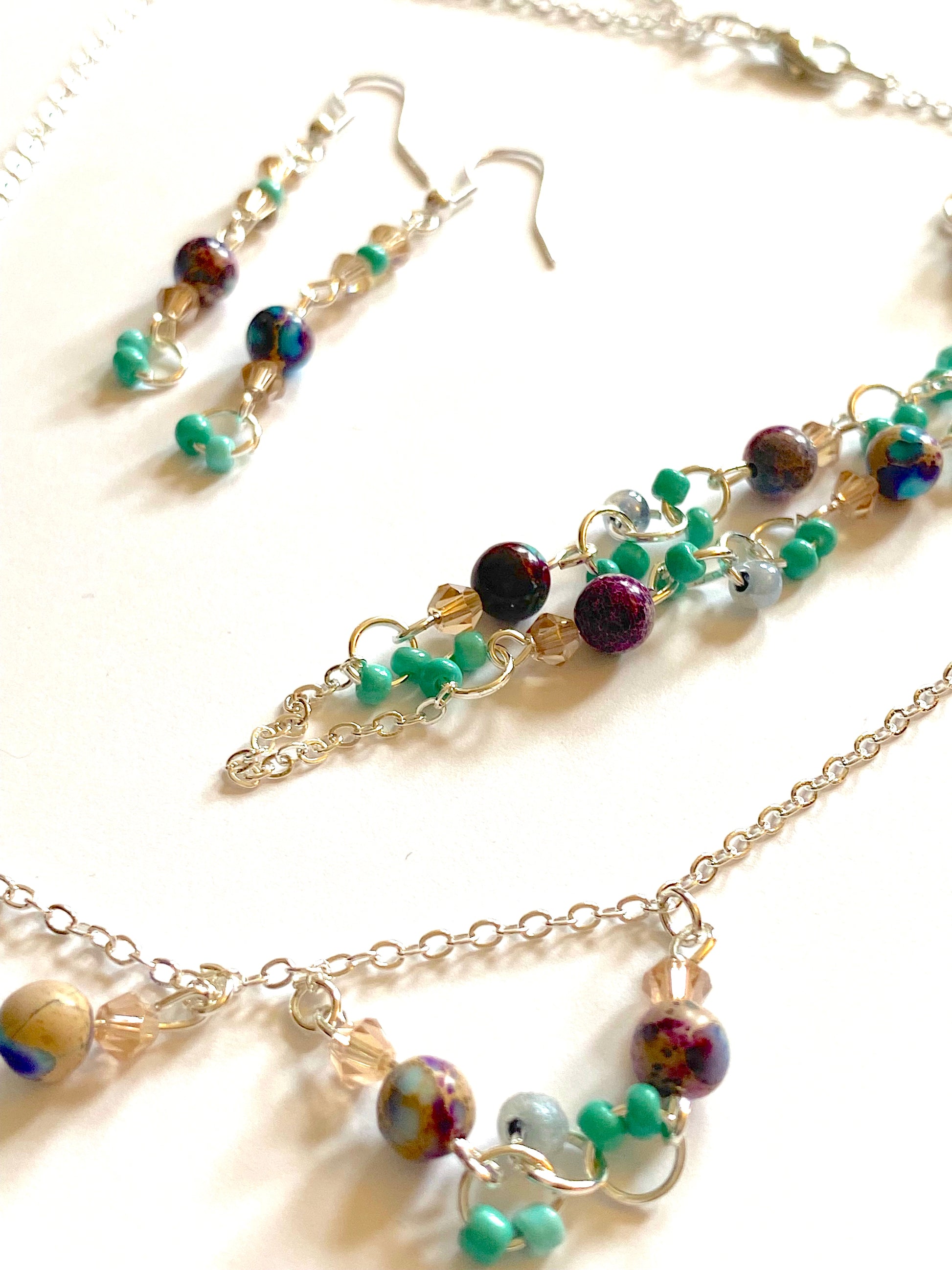 Match the imperial jasper necklace with the earrings and bracelet to create a stylish versatile look. The purple shades in the imperial jasper gemstone beads dance with the turquoise blue glass beads and champagne faceted crystal beads and metallic gray glass beads for a trendy spring appearance.