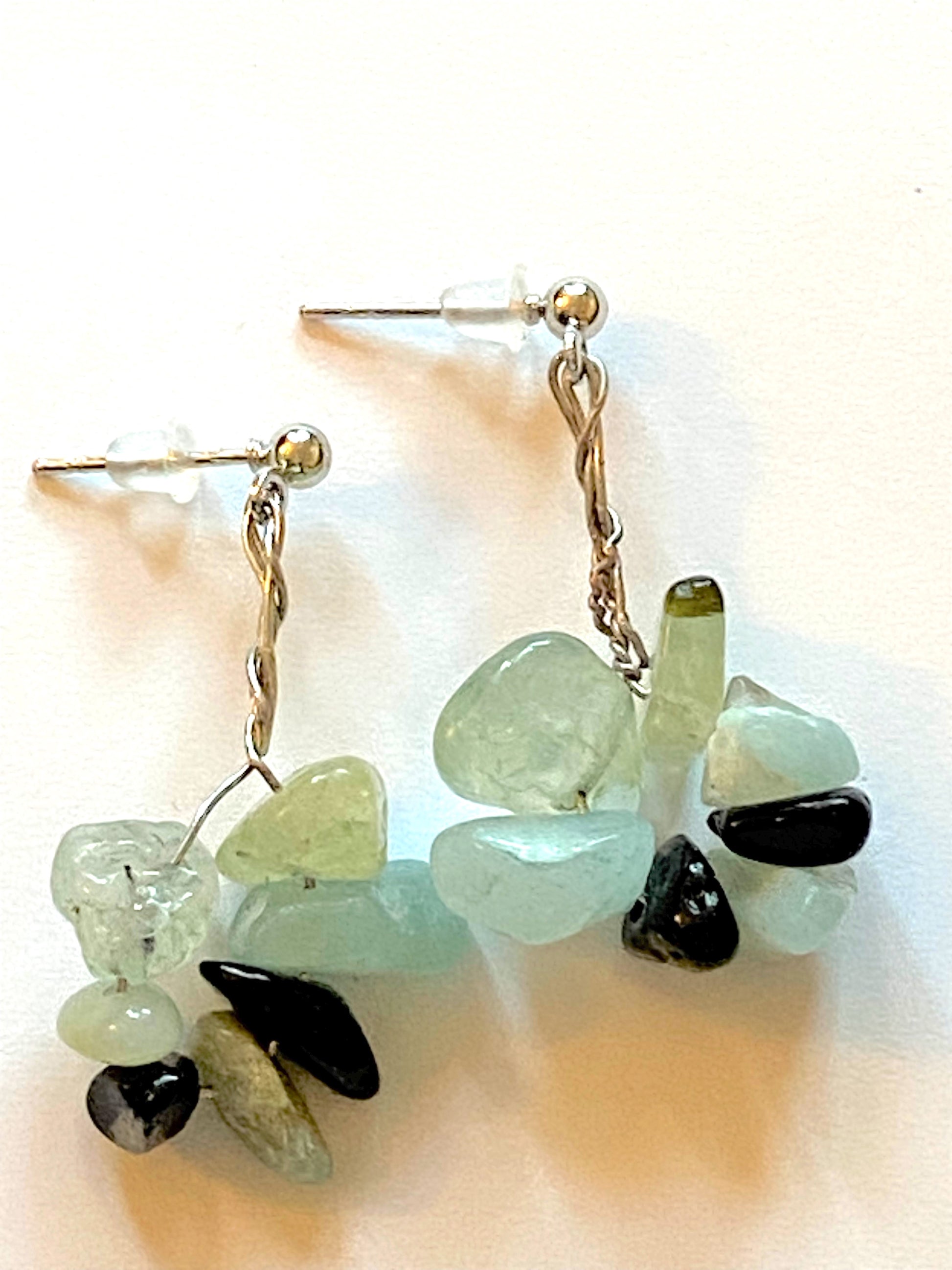 These dangling flower earrings are made by hand with green aventurine and snowflake obsidian gemstones. Black gemstones adds vivacity to the subtle glimmer of the sea green reflecting the shallow depths of the sea bed on a sunny mid morning. Vacation in style with these trendy handcrafted earrings.