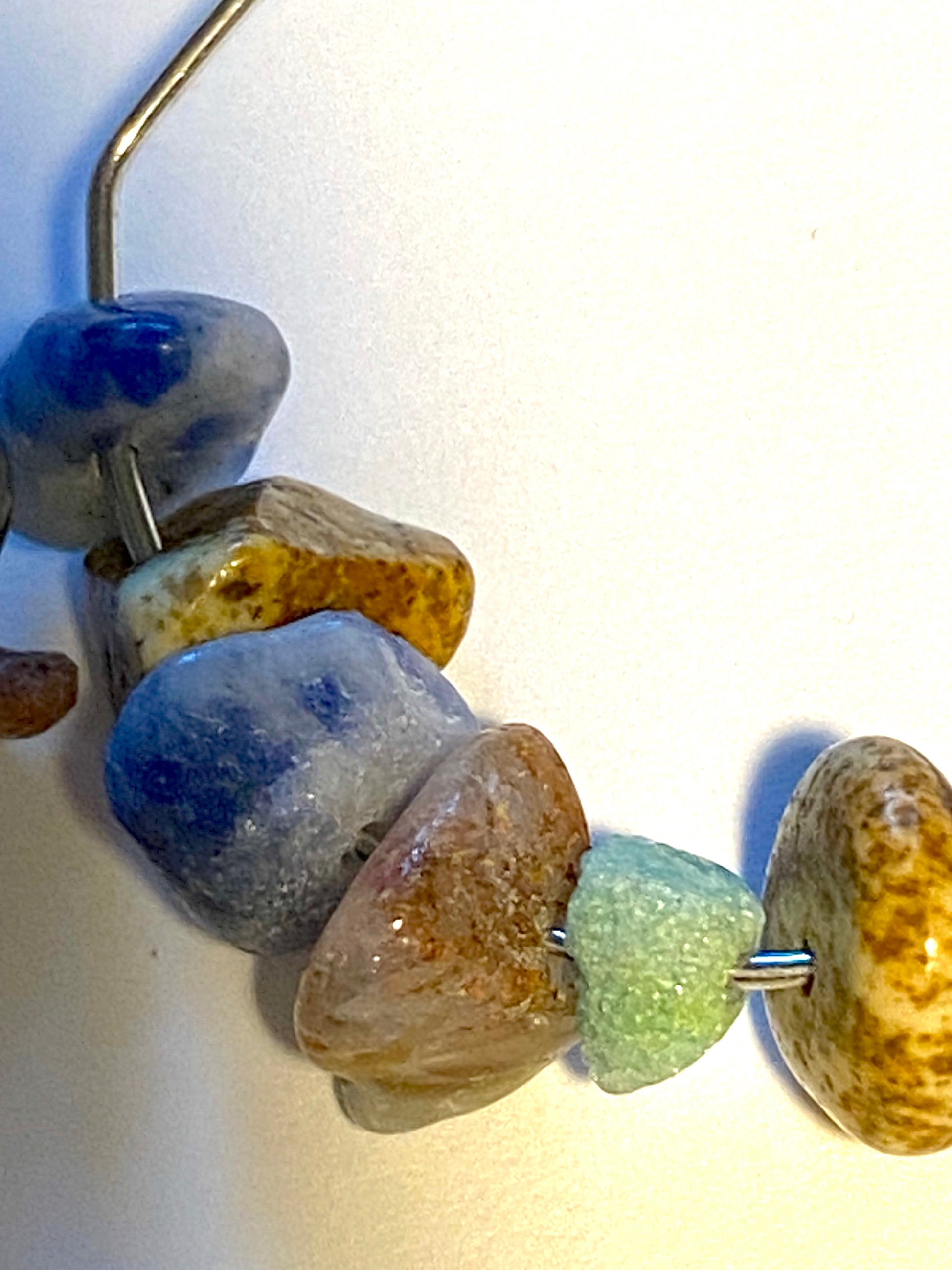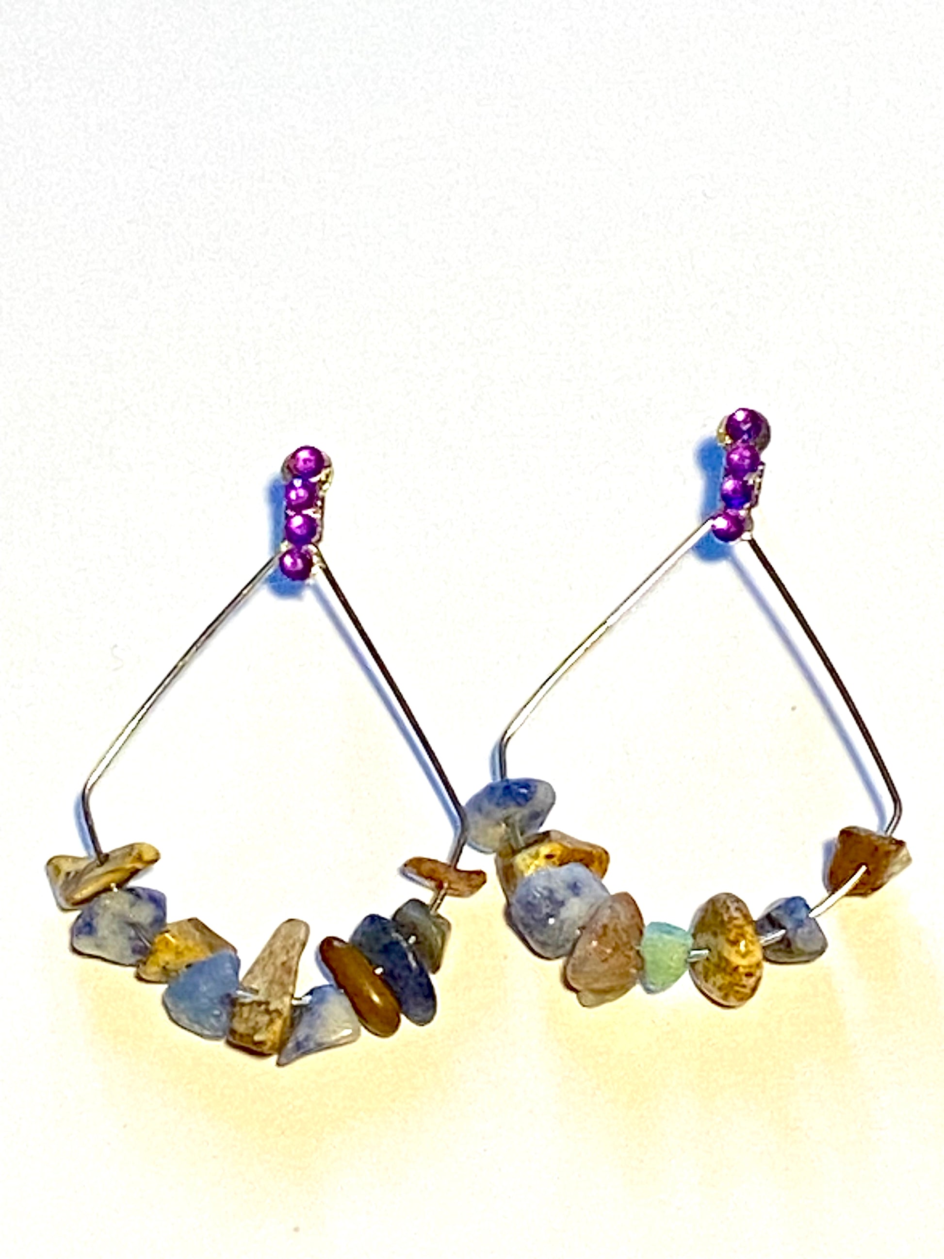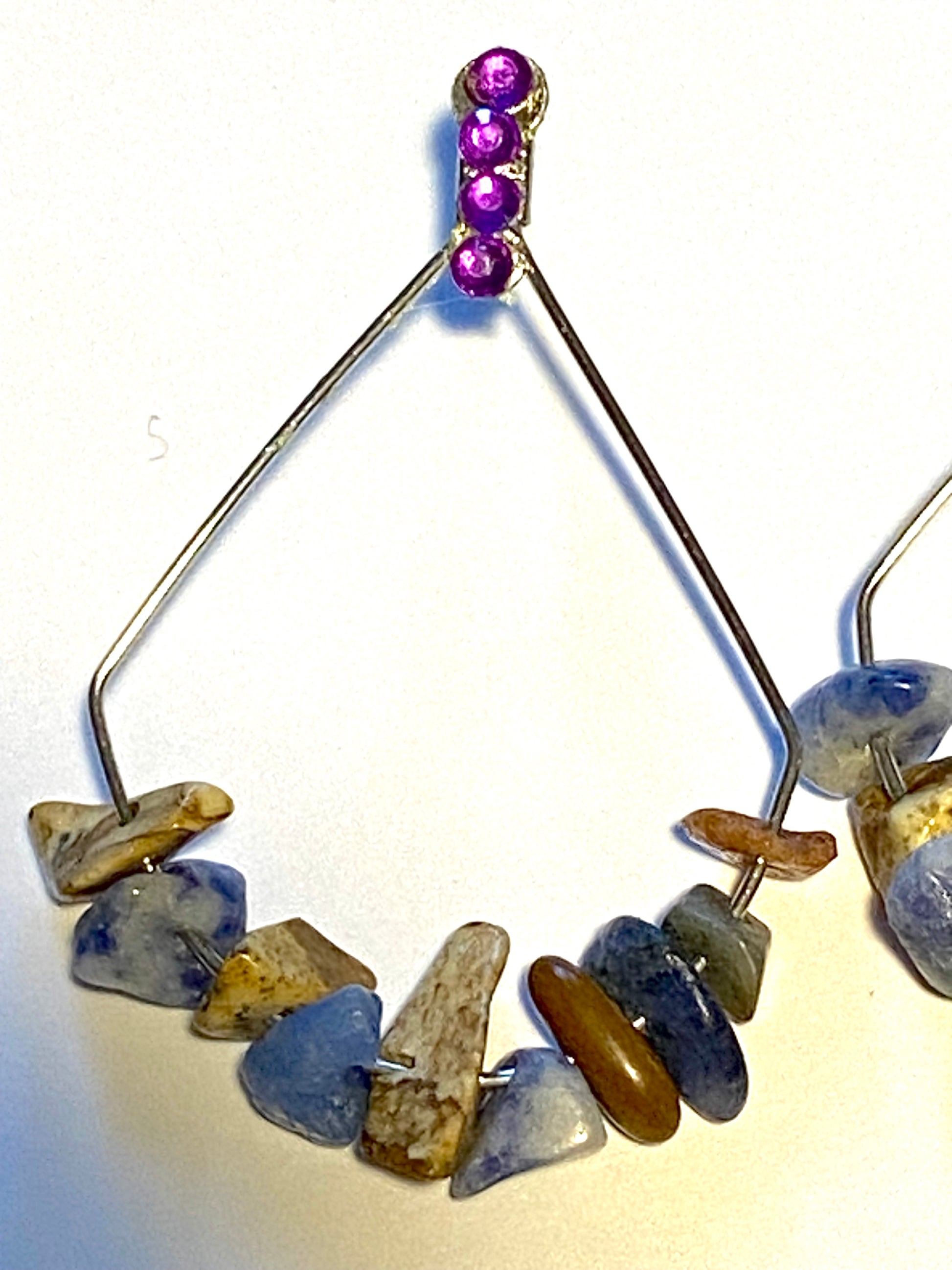 Blue sodalite and picture jasper gemstones add a touch of elegance to these simple hoop earrings. These handcrafted hoops add zing to your attire with tinges of blue-green shades and rock-like and sandstone-like texture. Purple rhinestones elevate trendiness with a glint of light.