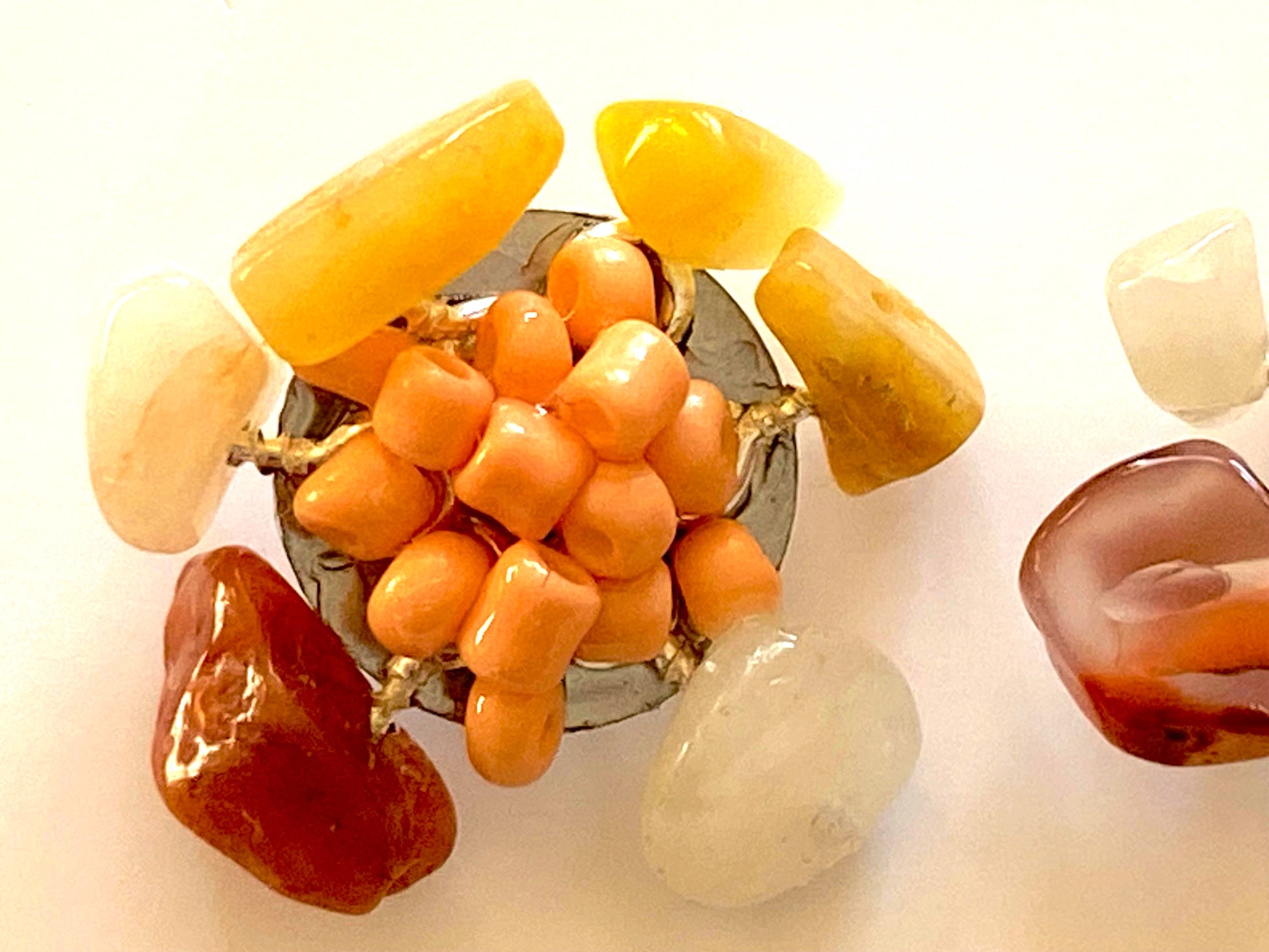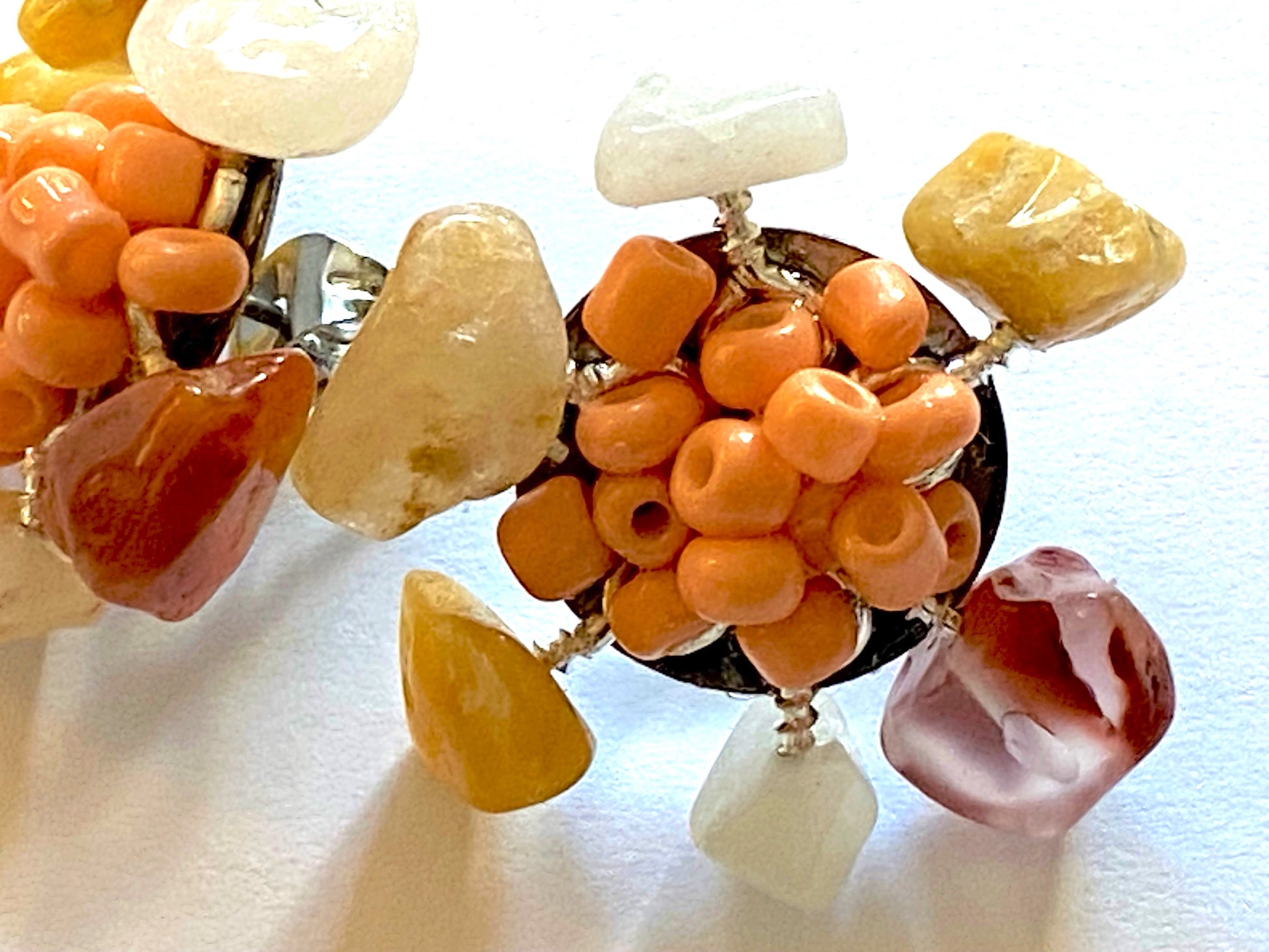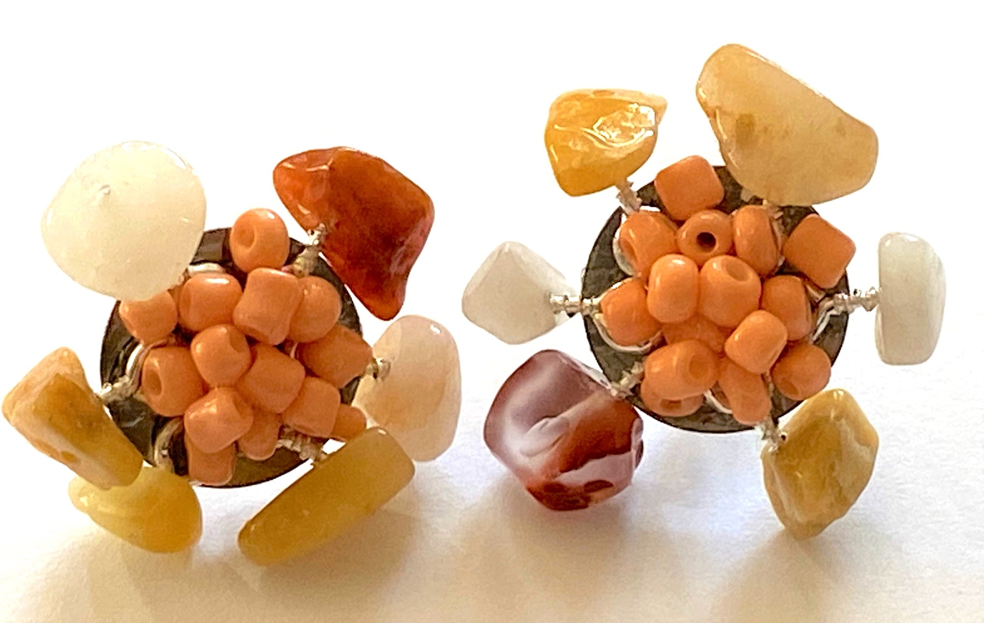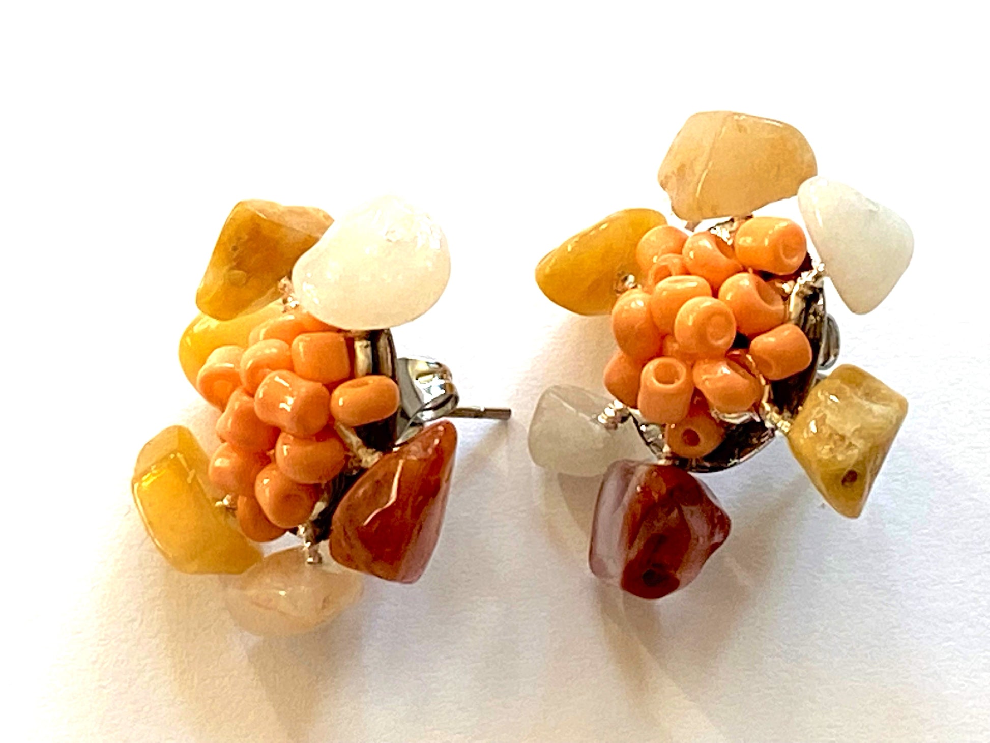 Piles of peach glass beads radiate yellow aventurine gemstones in these handmade earrings. These handmade large studs in peach, maroon, pale yellowish sandstone, and white shades are a radiant addition to your collection. Increase your fashion points by wearing it as your main jewel or with other accessories.
