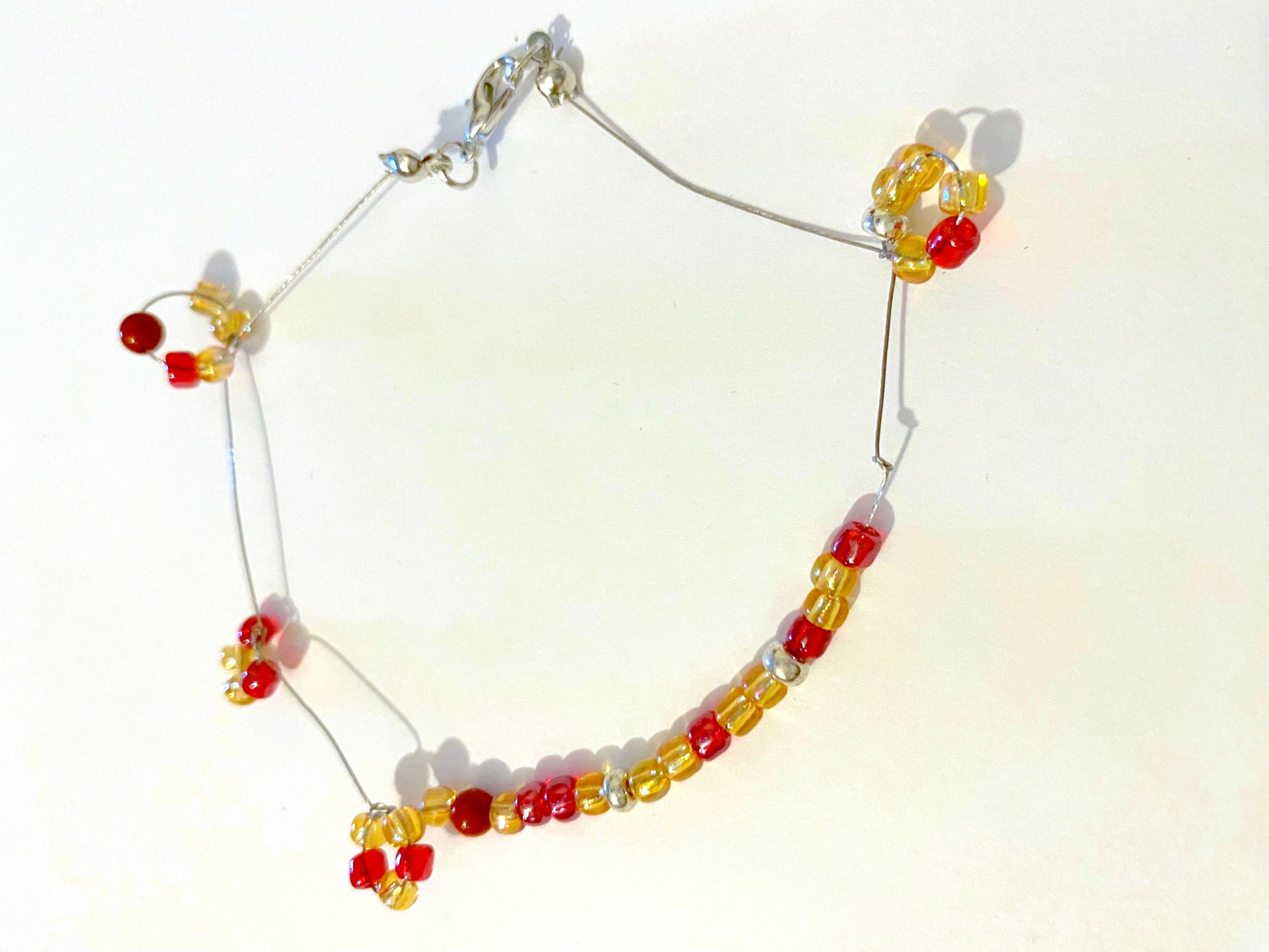 Adorn your favorite outfit with this delicate purplish red and pale translucent yellow glass bead bracelet with beaded circles. Add flair and style in bright tones.