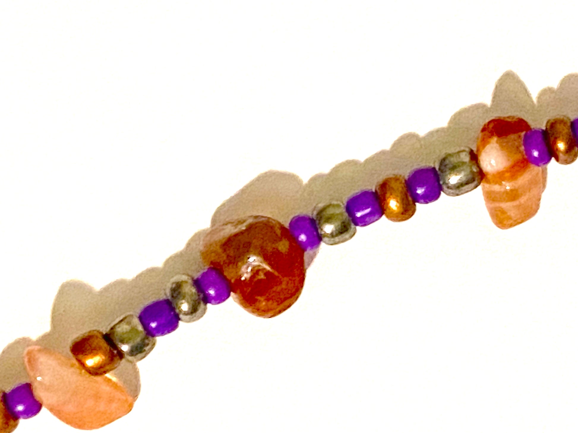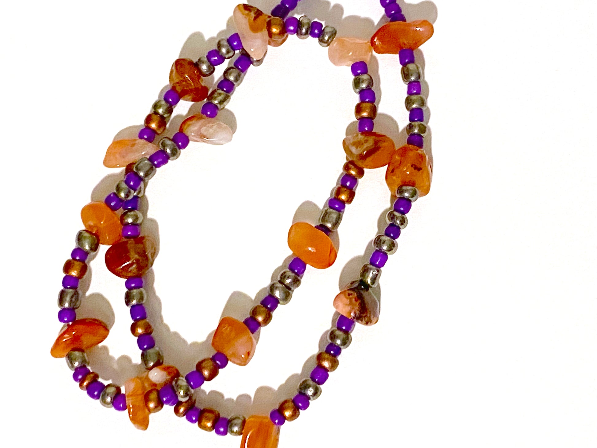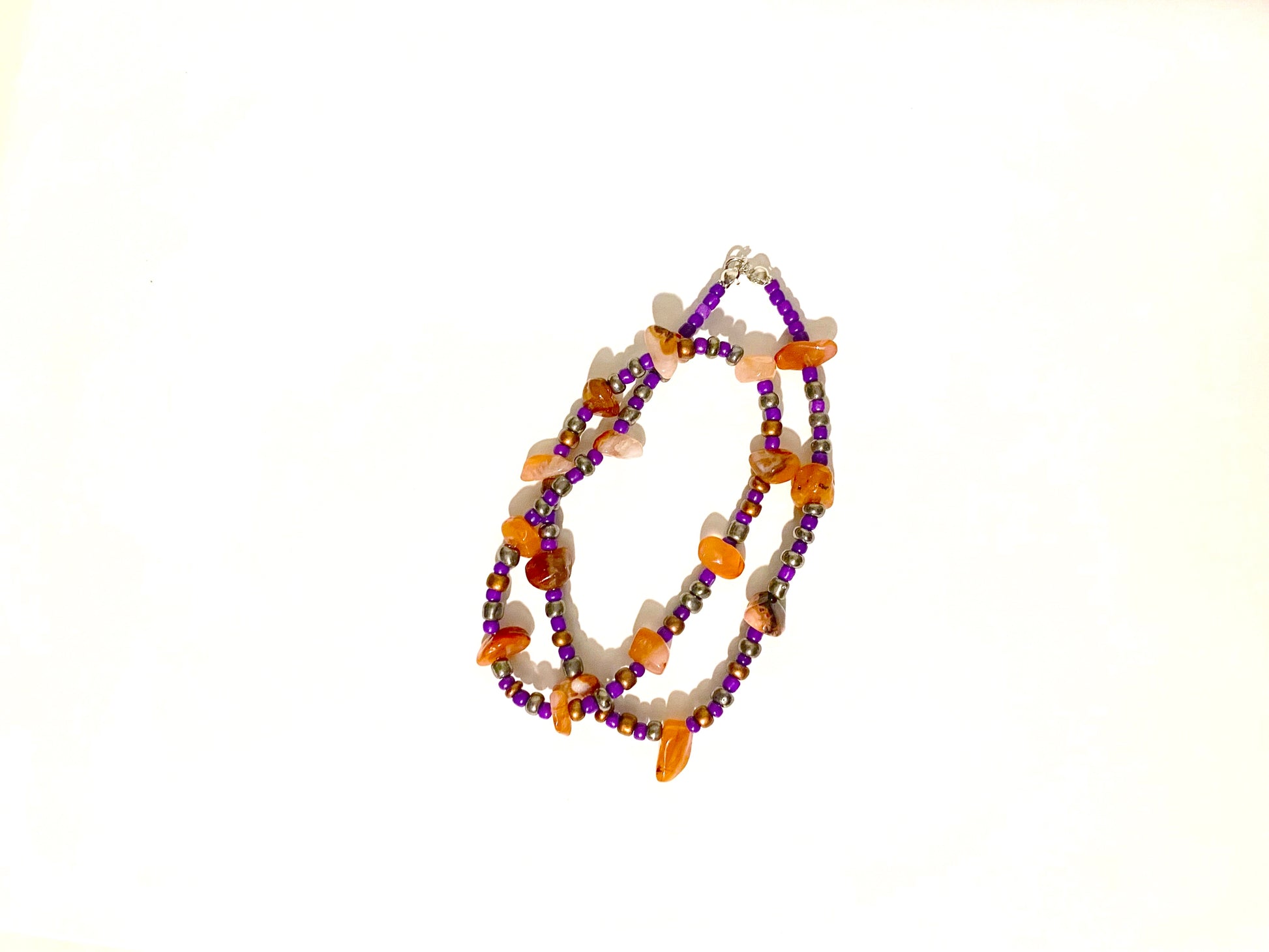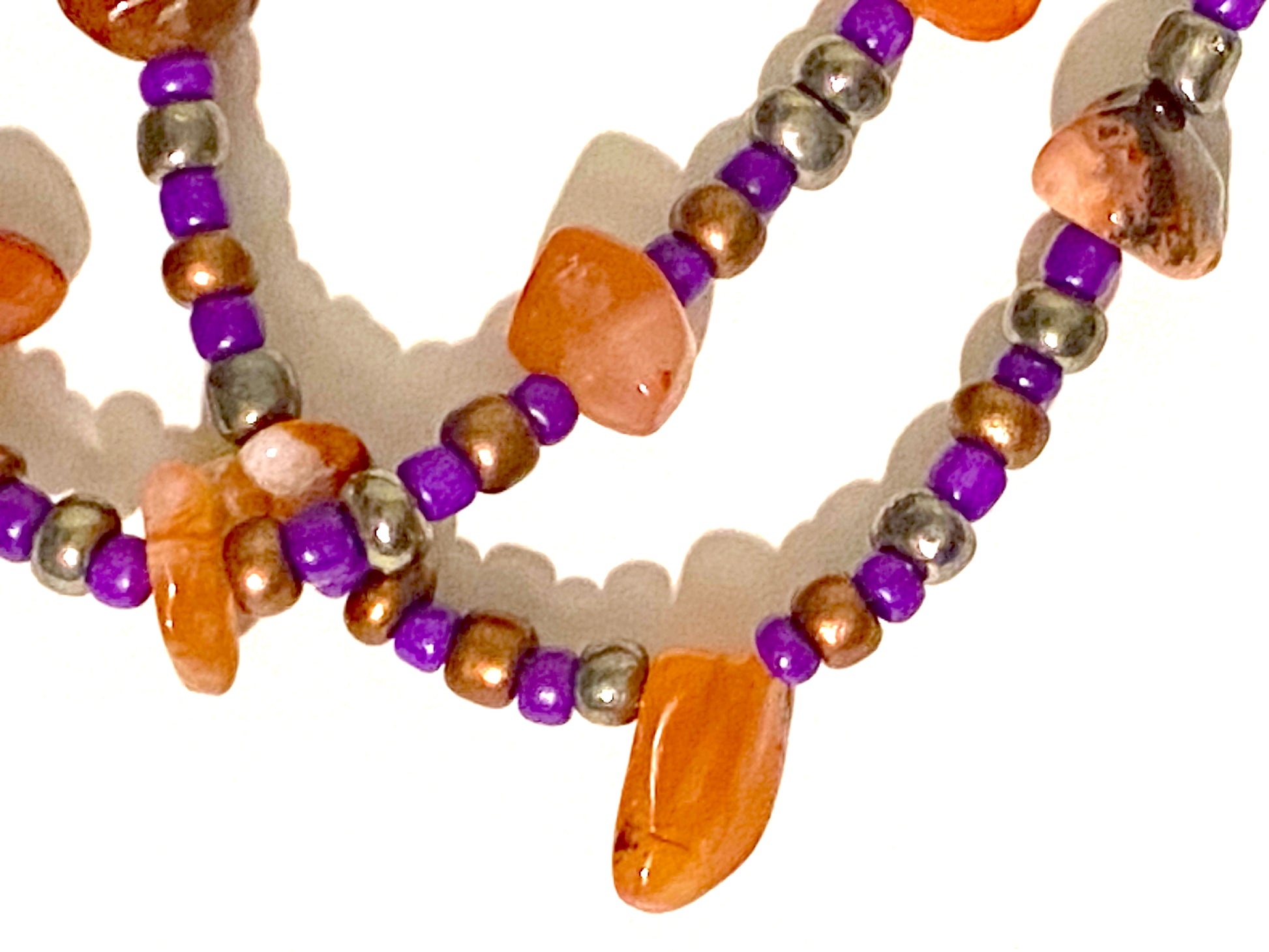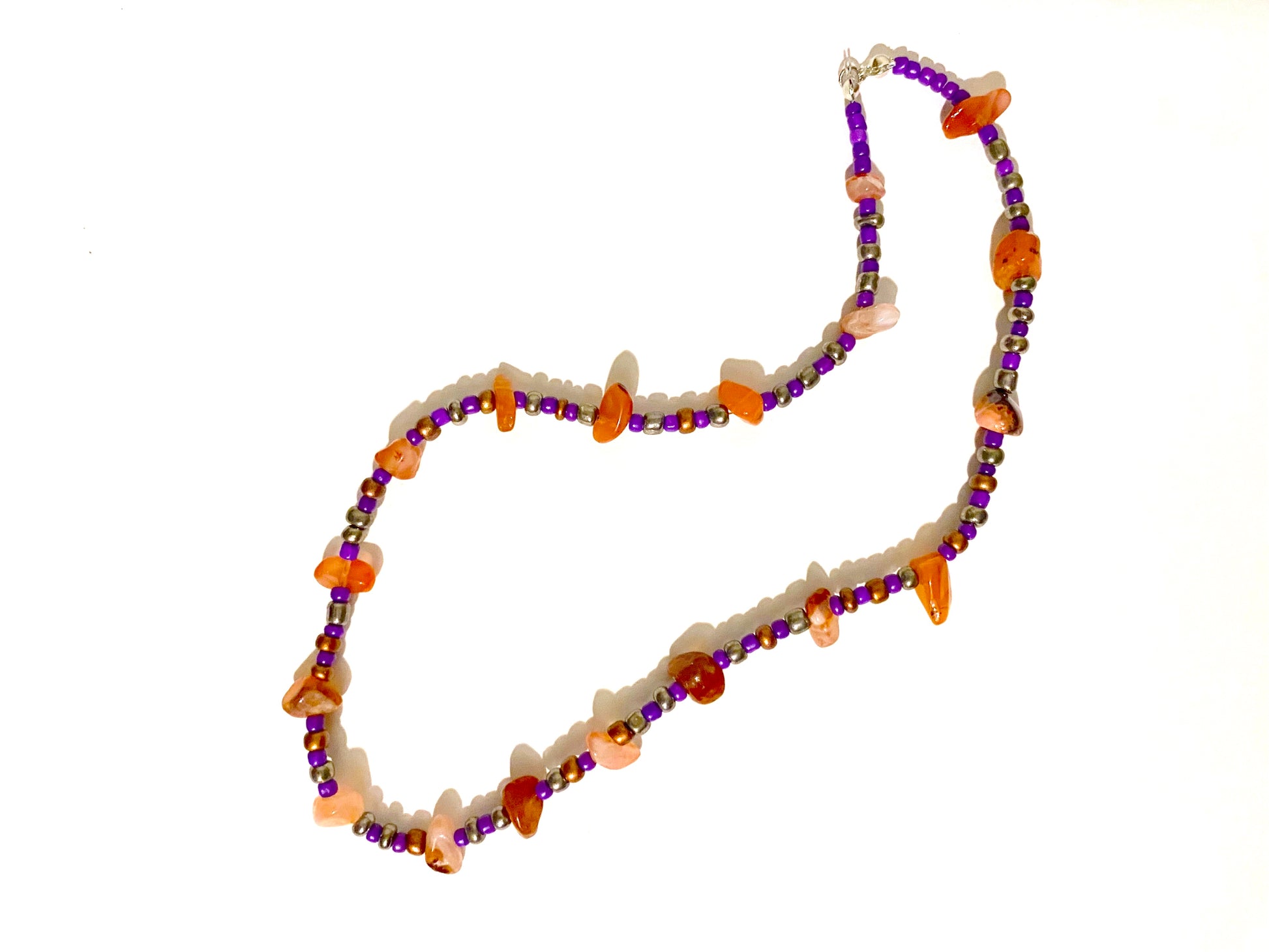 Red agate gemstones and a variety of glass beads in metallic, violet, and brown tones in this necklace add shine to your outfit.