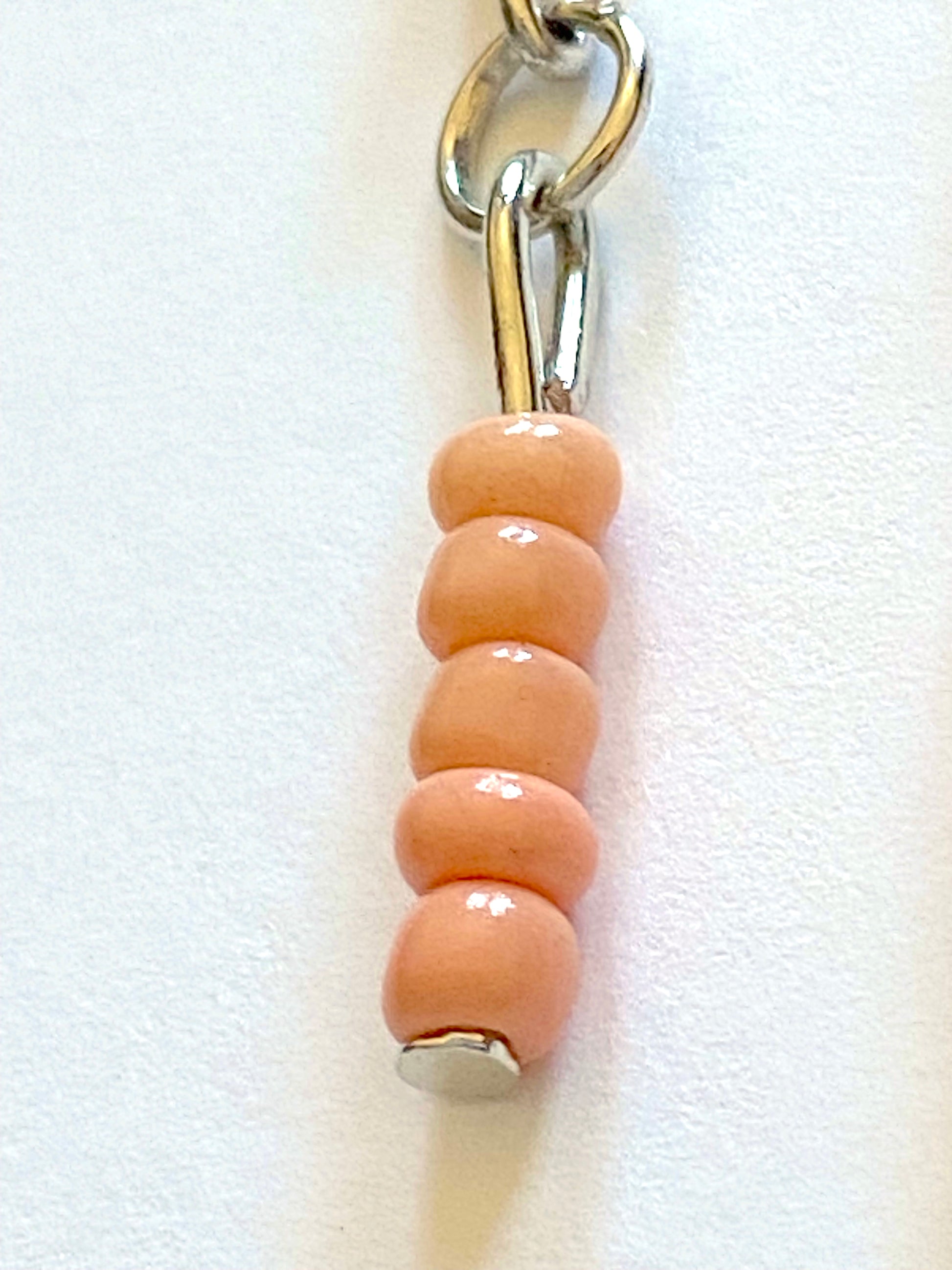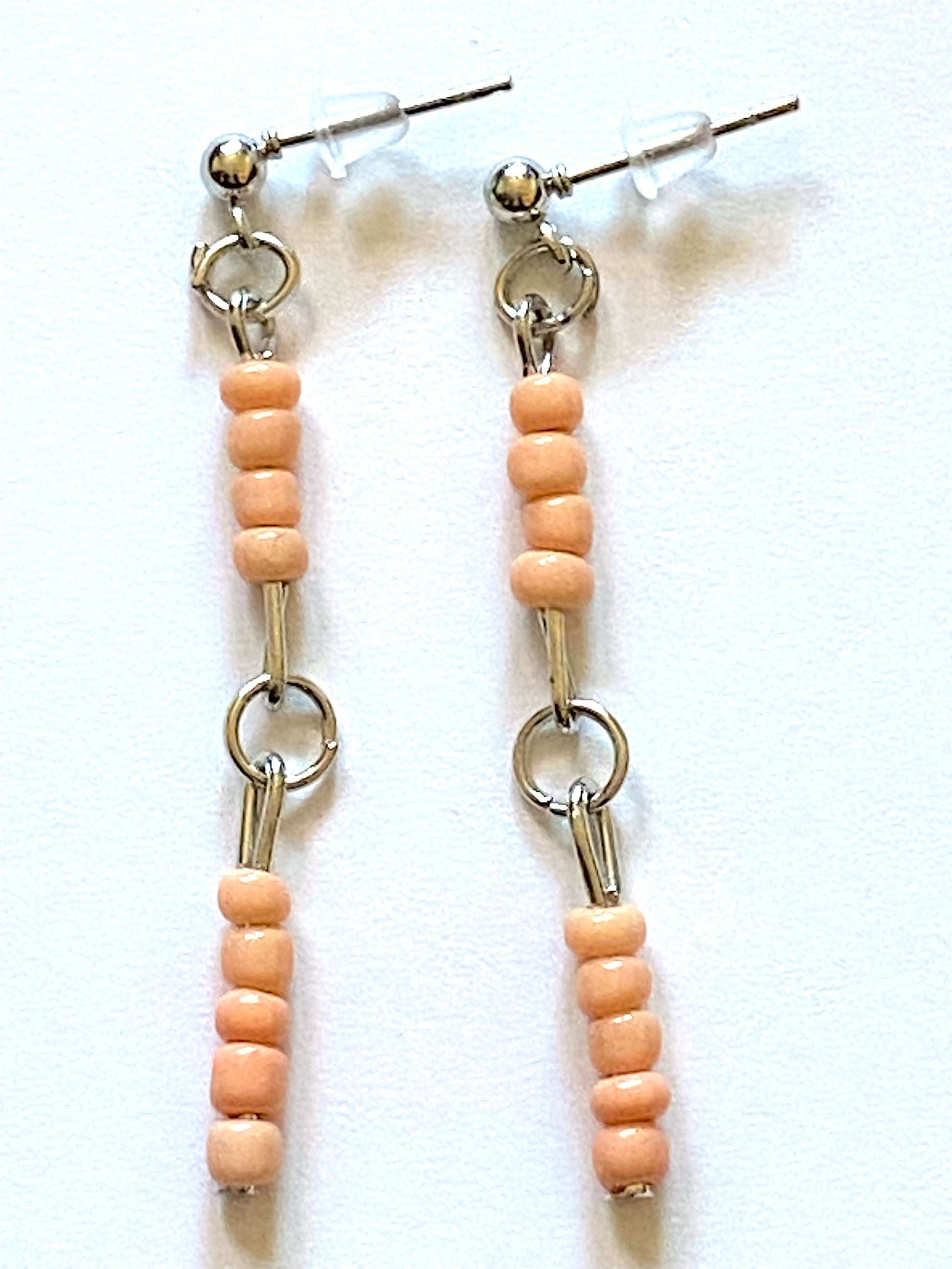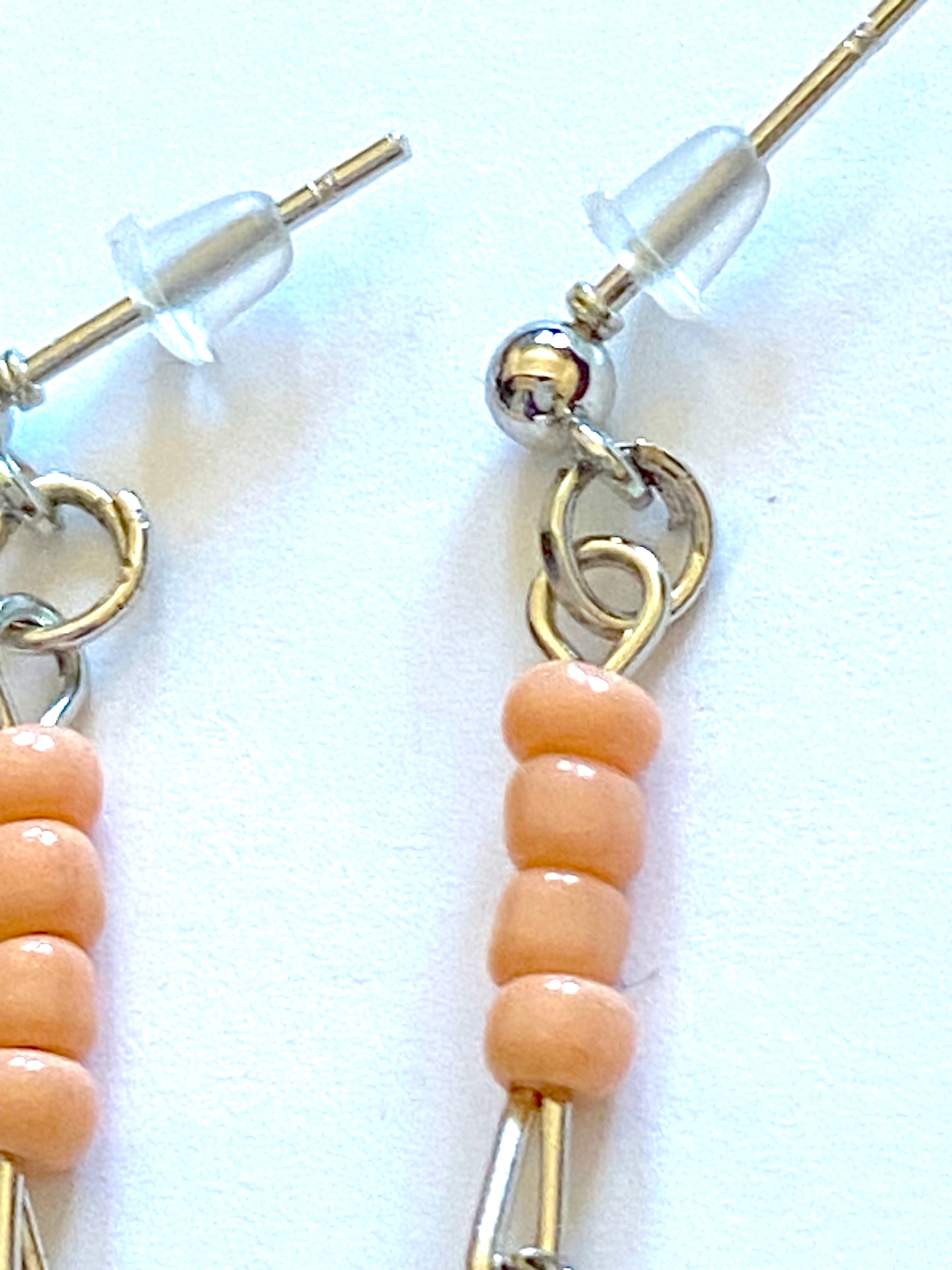 Dangle strings of peach glass bead earrings for a delicate look. These handmade earrings add to trendy or casual outfits.