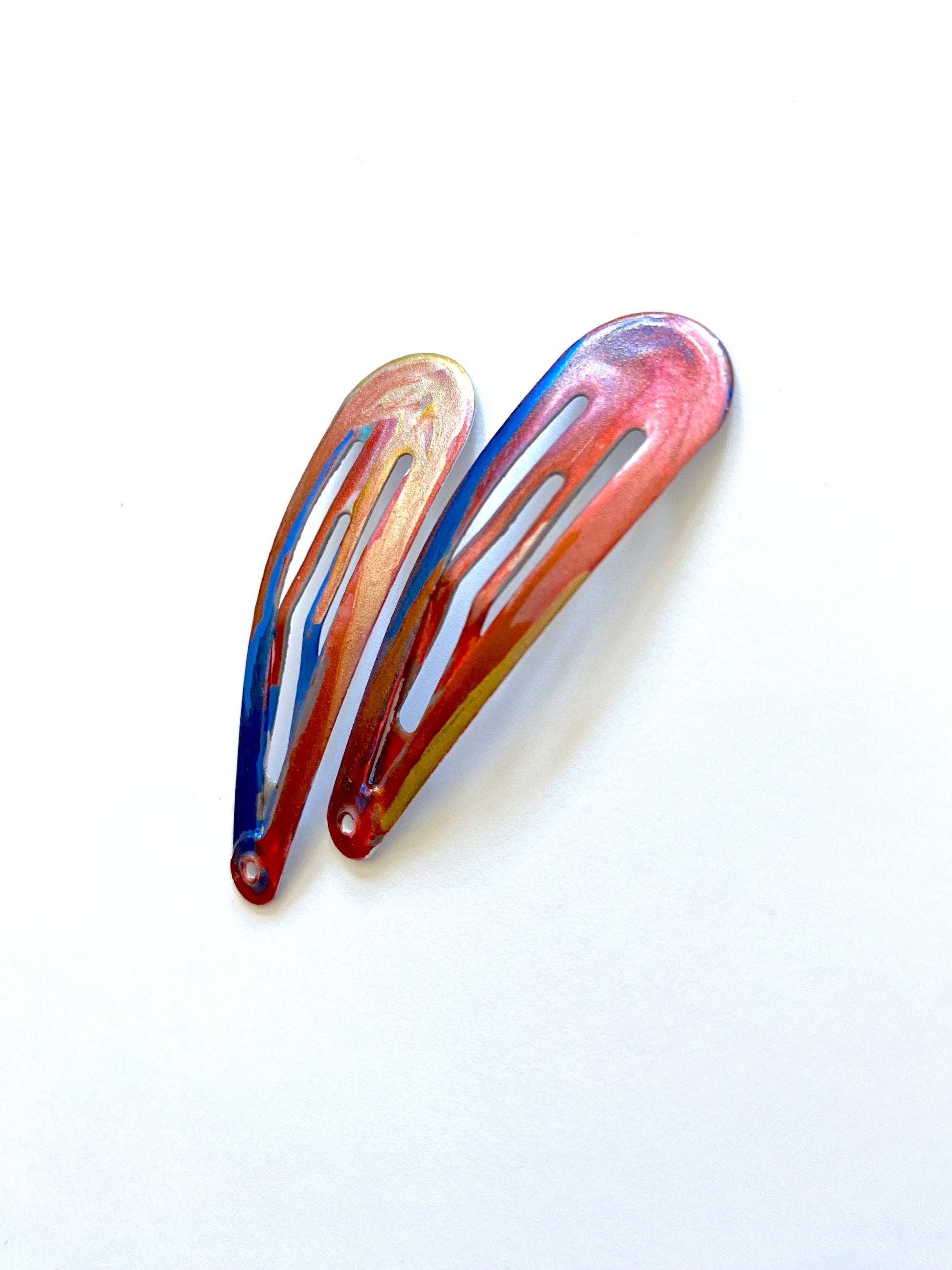 Mix of blue, red, and gold colors on the barrette represent sunset shades. Show off your outfit with these elegant hair accessories.