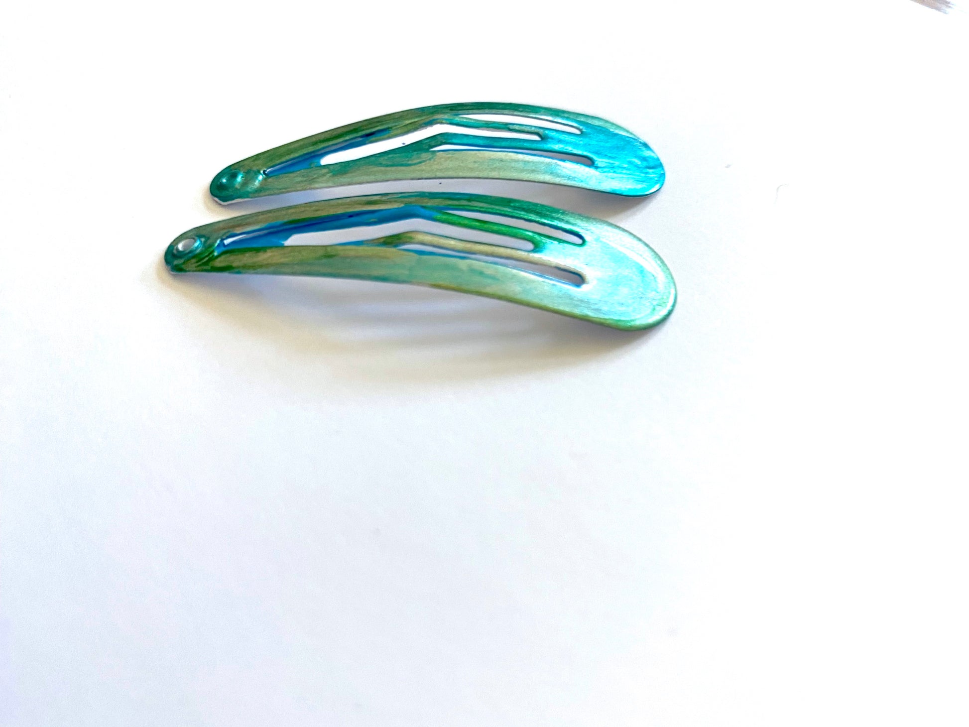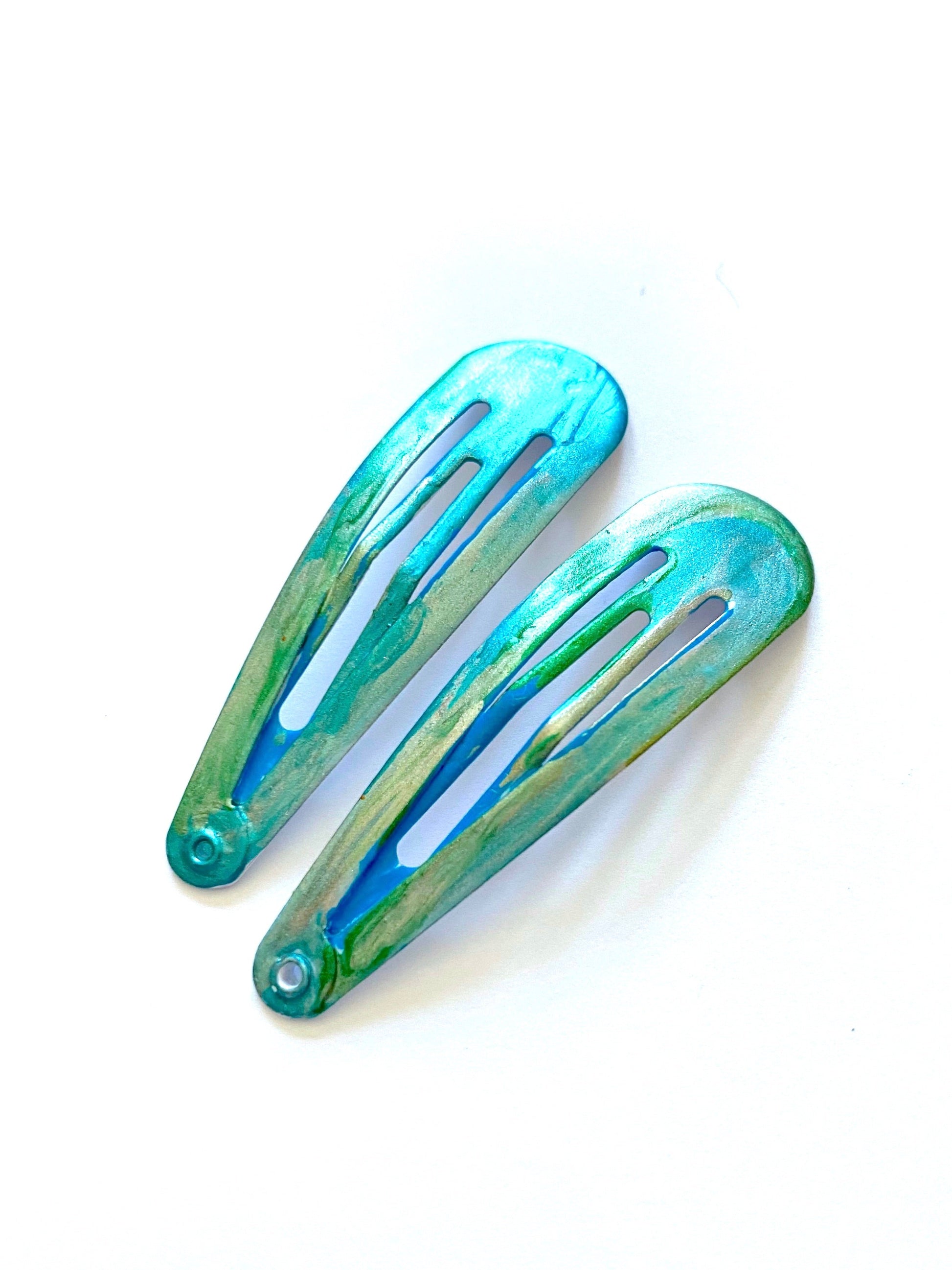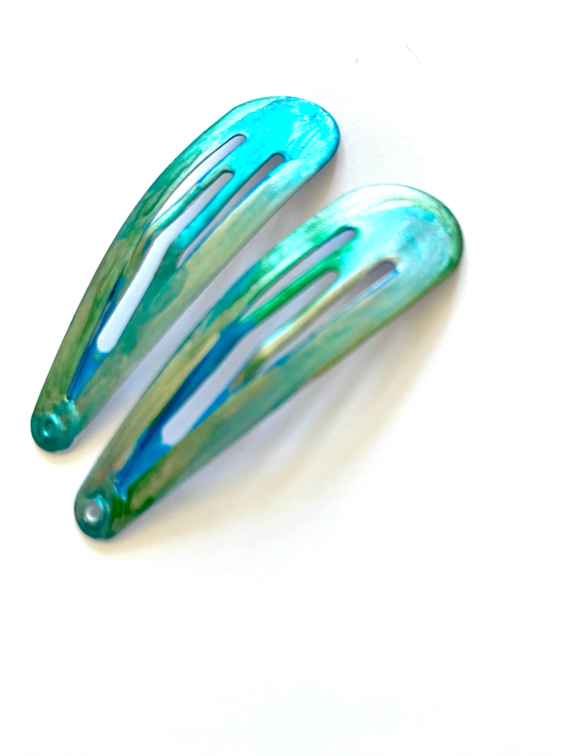 Turquoise and green were mixed to hand-paint a sea green effect on these barrettes. Use these with your evening or day apparel. Incorporate contemporary art into your attire with these fashionable accessories.
