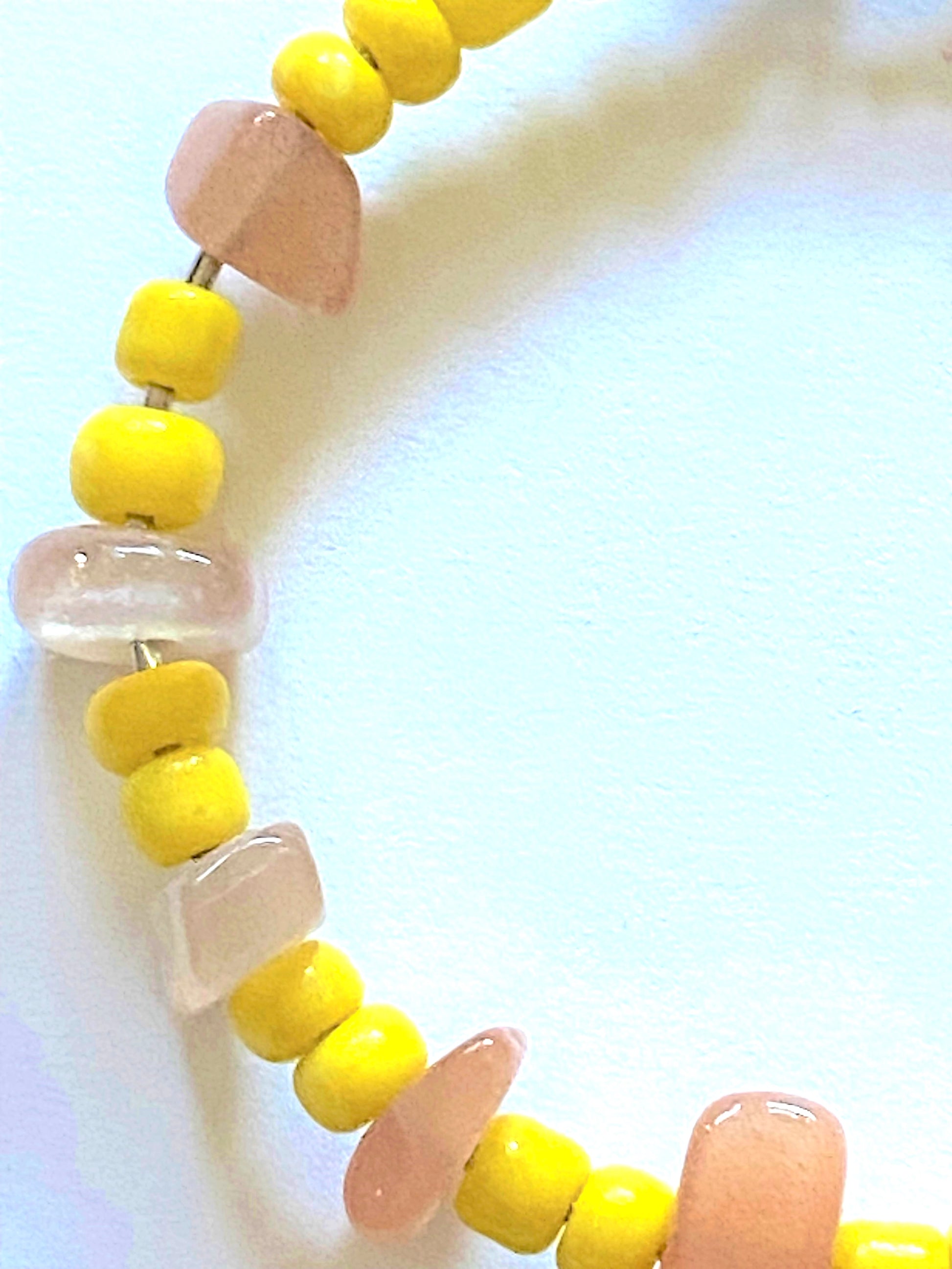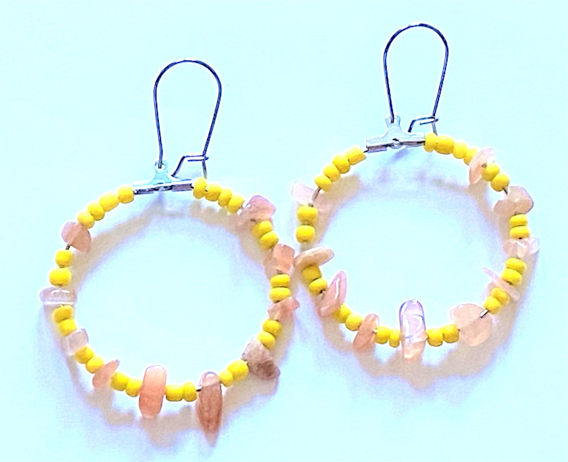Sunshine and pastel hues together create a bright look with these hoop earrings made with sunstones and yellow glass beads. These handcrafted earrings are must-have accessories for a daring adventure or a casual trip.