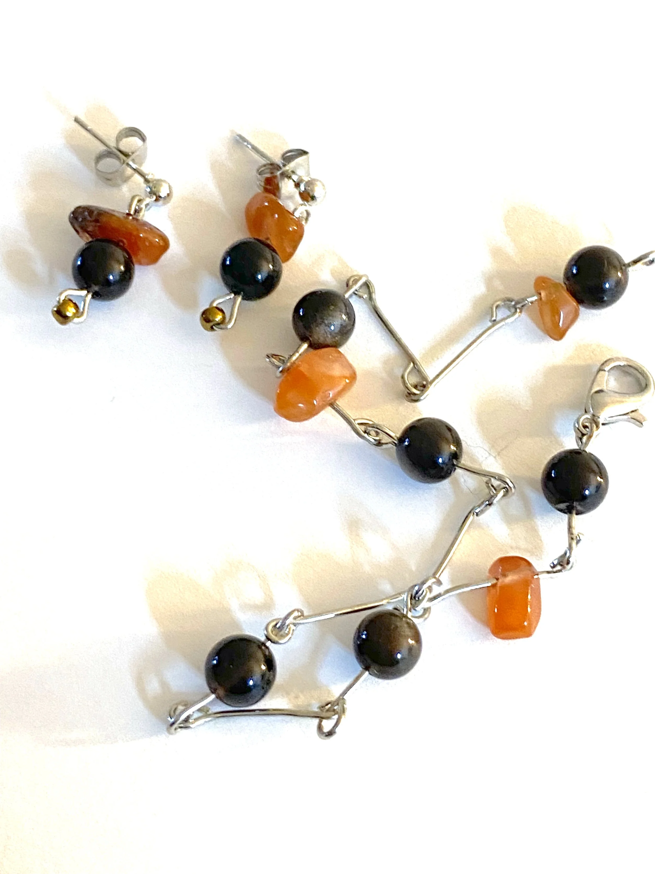 This matching set includes a necklace, a pair of earrings, and a bracelet. Length of the necklace and bracelet can be adjusted with metal clasps and extra metal chain.